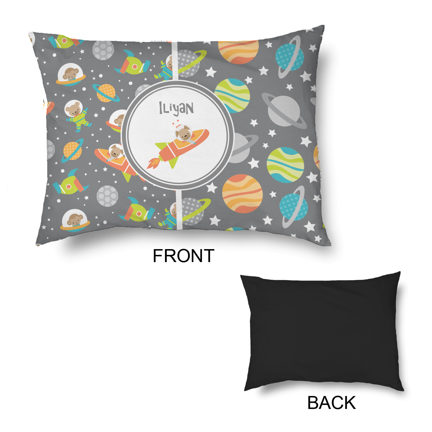 The design is filled with adorable little animal friends in space suits and space ships! On the other side, there are cute little coordinating planets! The bright colors on the animals and planets make for a great contrast to the dark grey background.