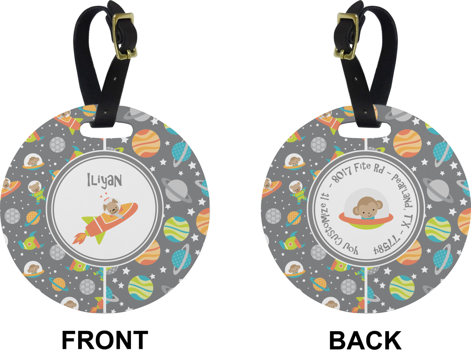These personalized bag tags are sold in a variety of shapes, so that you may find the product that meets your vision exactly. We sell a round luggage tag, which measures at approximately 4" x 4". Our square luggage tag is about 3.5" x 3.5", while our rectangular version is 2.75" x 4 ".