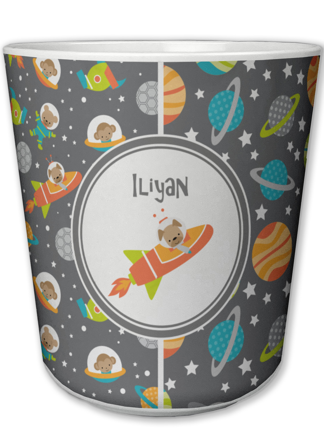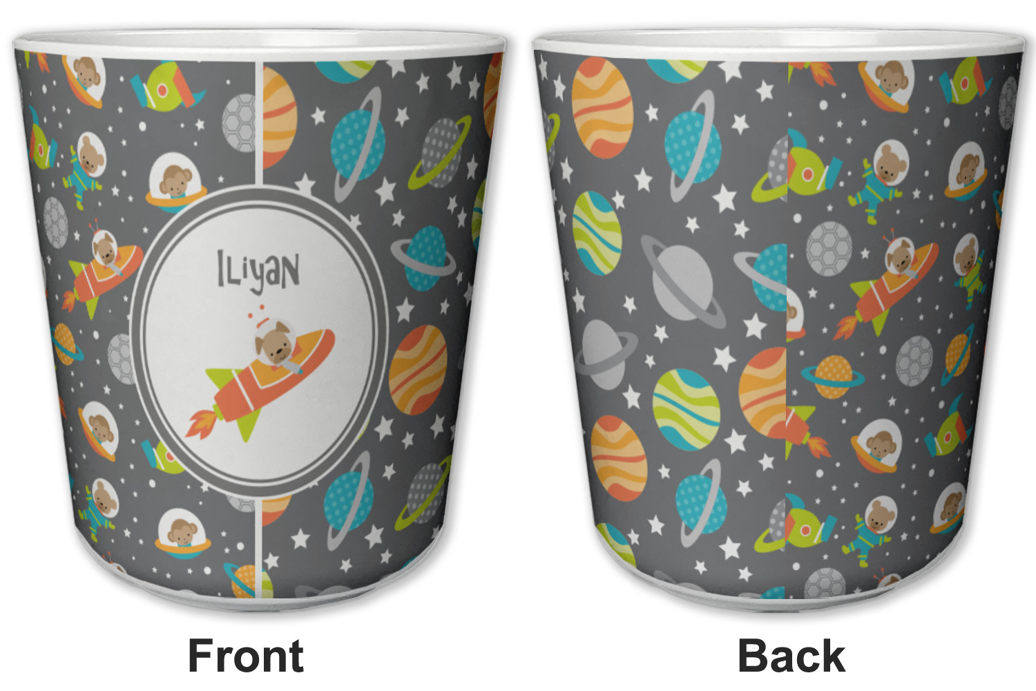 The design is filled with adorable little animal friends in space suits and space ships! On the other side, there are cute little coordinating planets! The bright colors on the animals and planets make for a great contrast to the dark grey background.