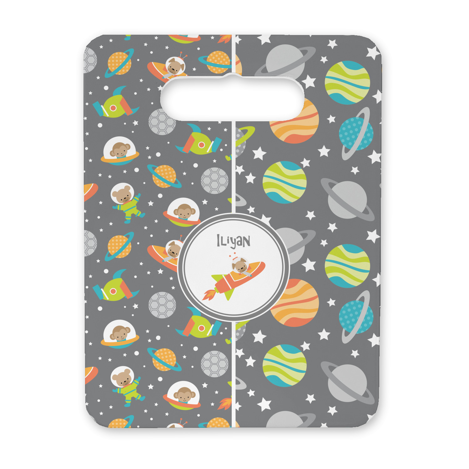The design is filled with adorable little animal friends in space suits and space ships! On the other side, there are cute little coordinating planets! The bright colors on the animals and planets make for a great contrast to the dark grey background.