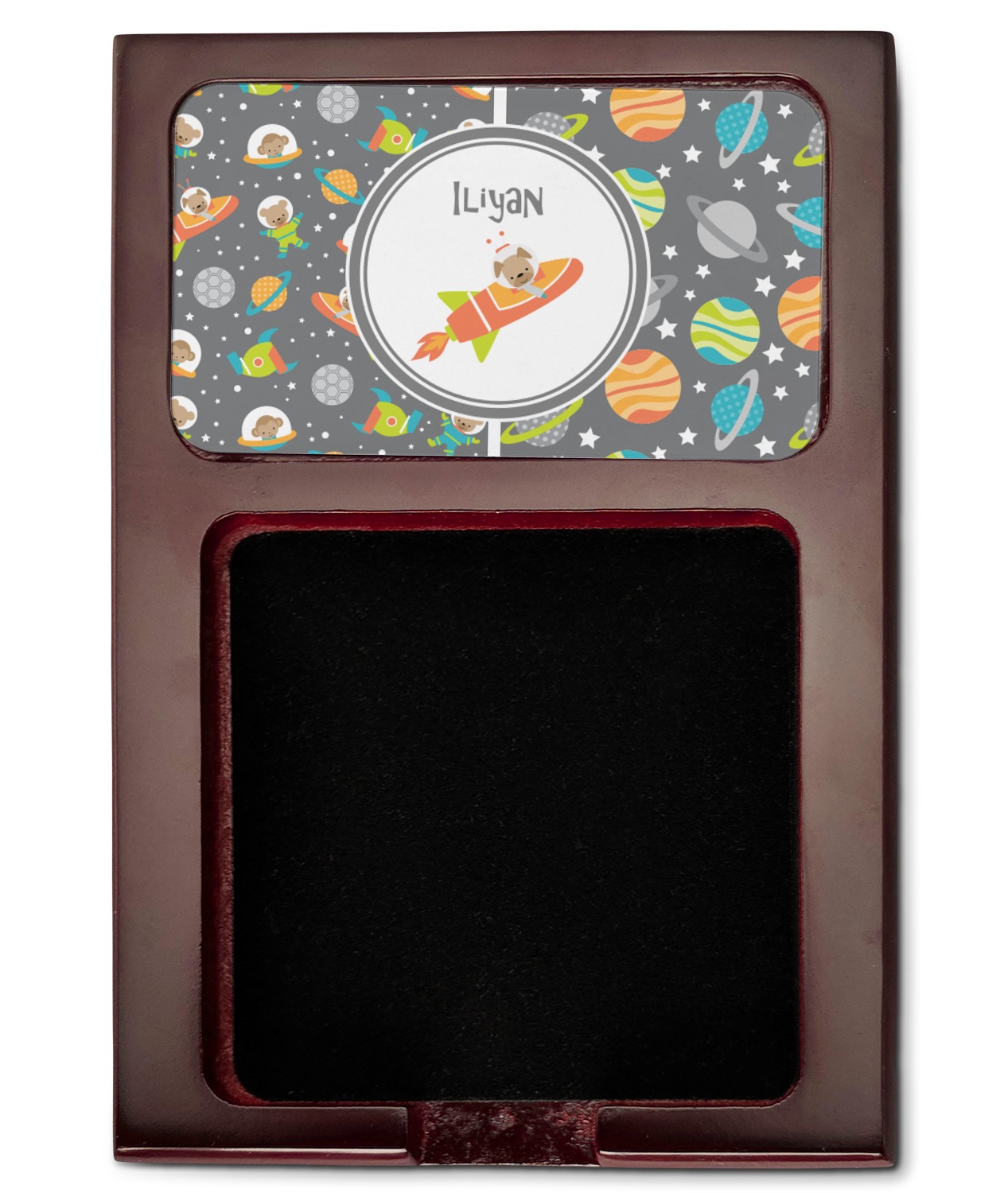 Crafted from a fine mahogany, this post it note holder is in the shade of a dark, cherry color. The dispenser itself is about 4.25 by 6.25 by 0.75 inches. You can place your 3 by 3 inch sticky notes in the indentation below the nameplate. We print your customization onto the nameplate that rests above the velvety indentation.