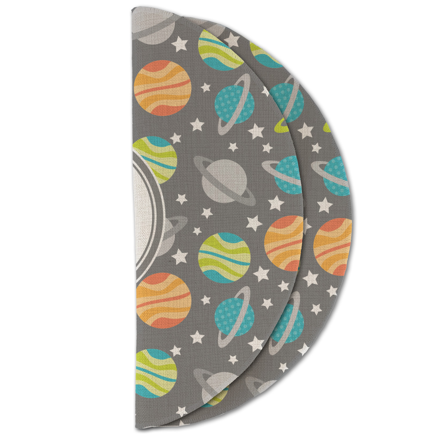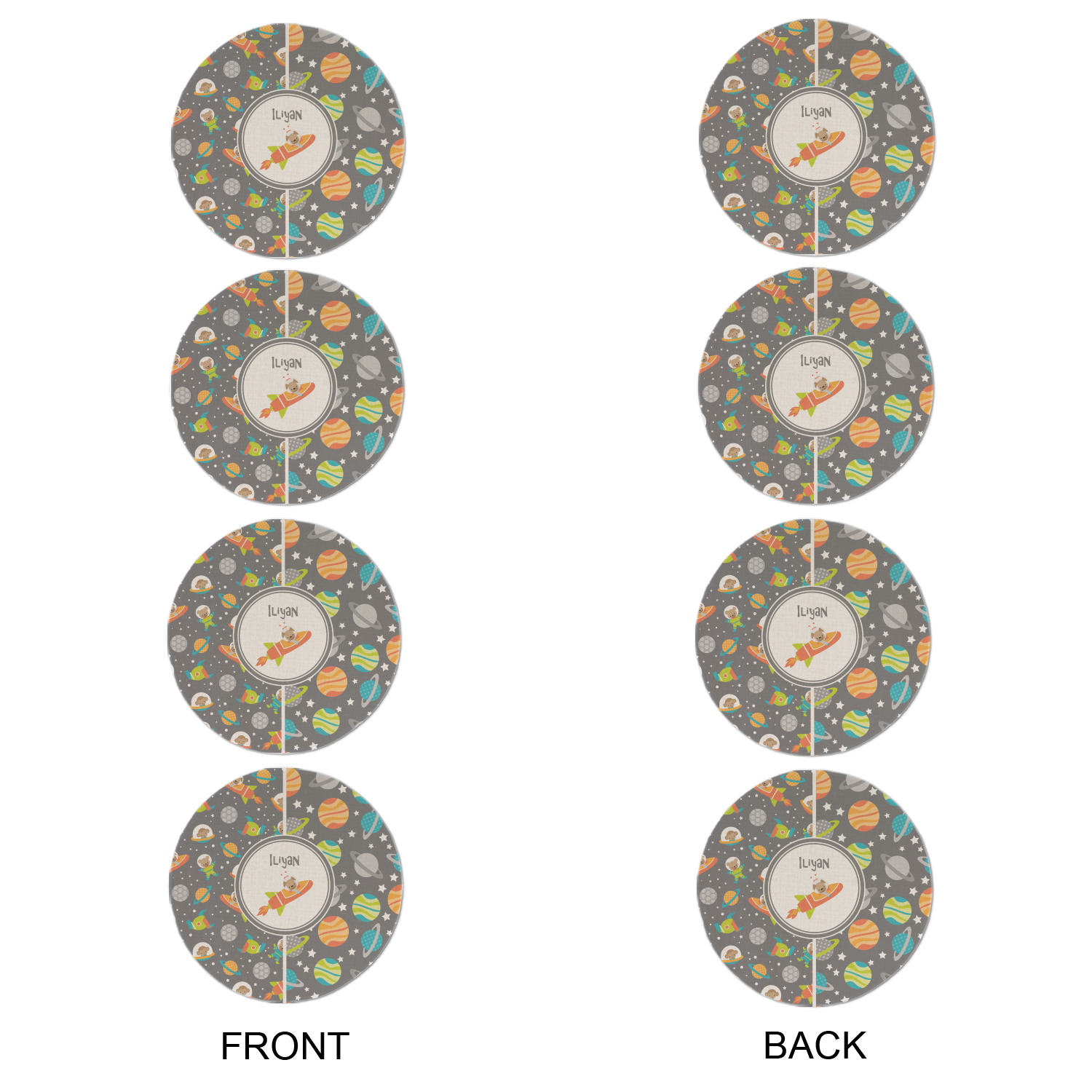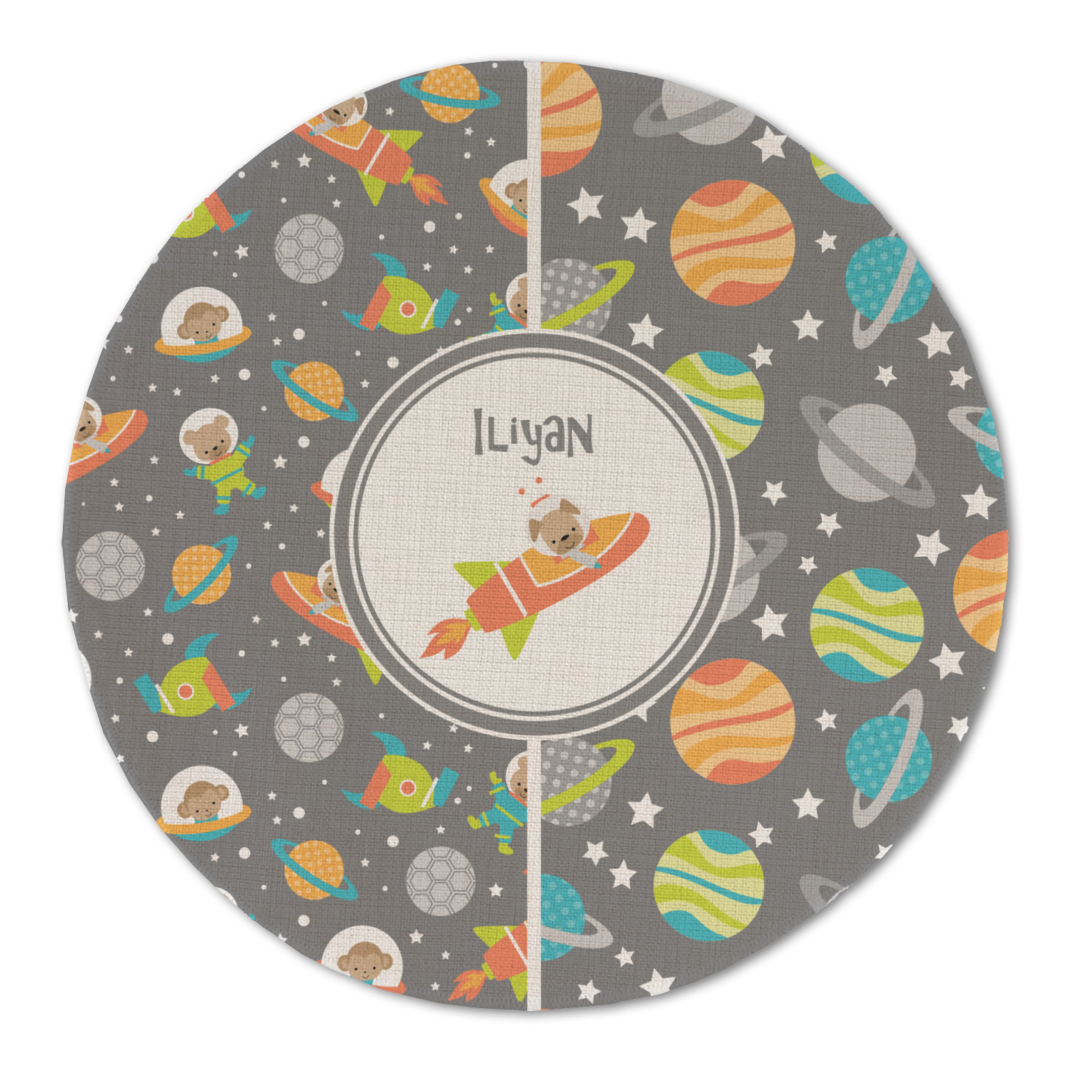 The design is filled with adorable little animal friends in space suits and space ships! On the other side, there are cute little coordinating planets! The bright colors on the animals and planets make for a great contrast to the dark grey background.