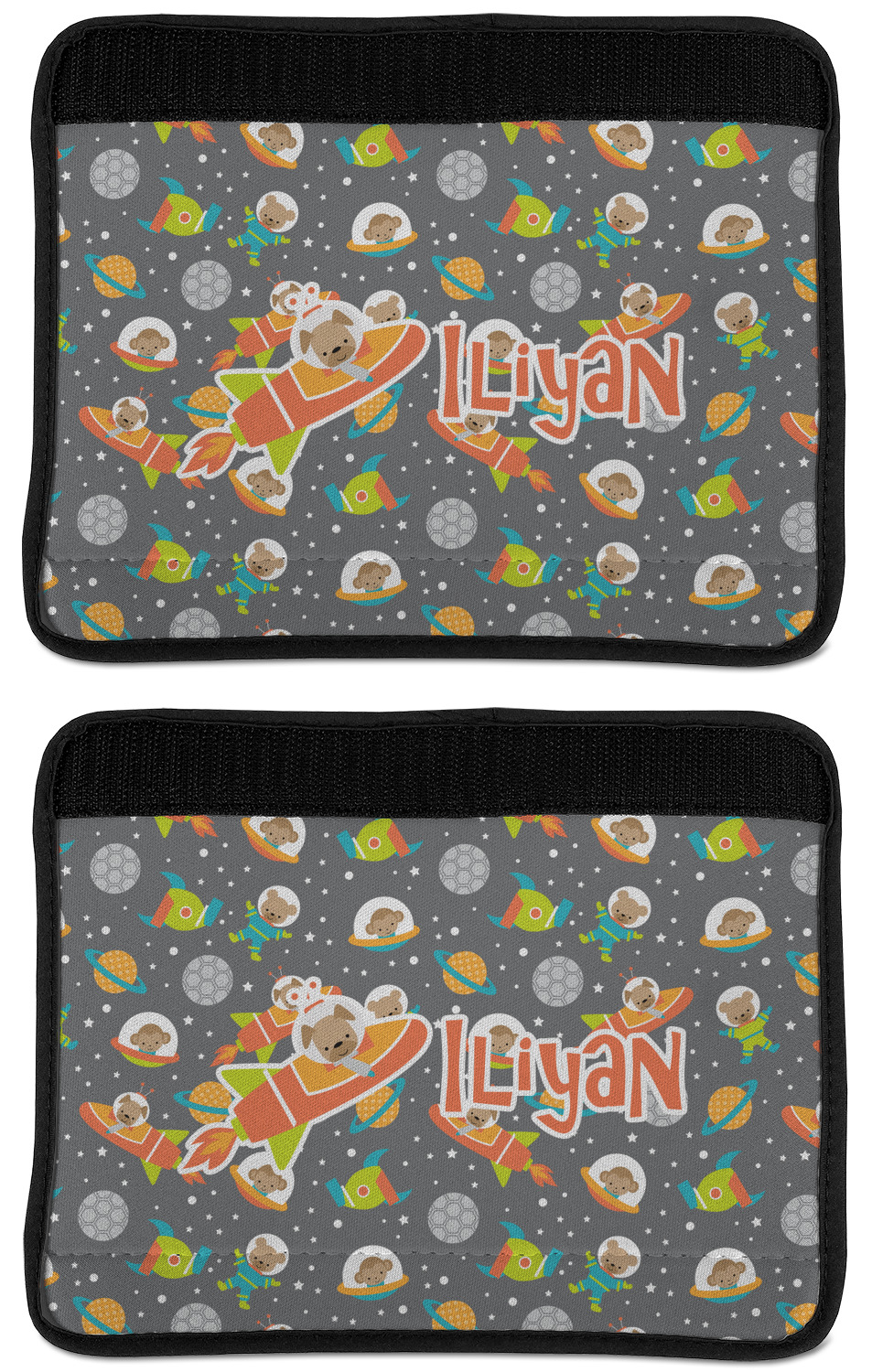 Made from neoprene, our seat belt strap covers wrap around the belt itself and have a Velcro tab for easy attachment and closure. The belt's edges are trimmed with a black polyester for a secure finish. Each cover is 9.5 by 7 inches when open and 9.5 by 2.5 inches when closed. We print your personalized design on the face of the seat belt pad.