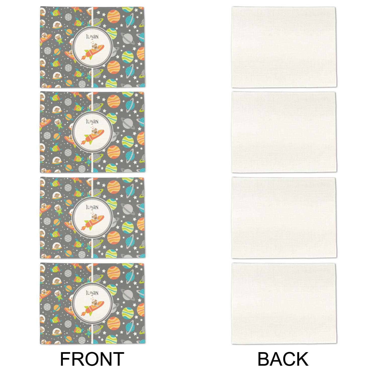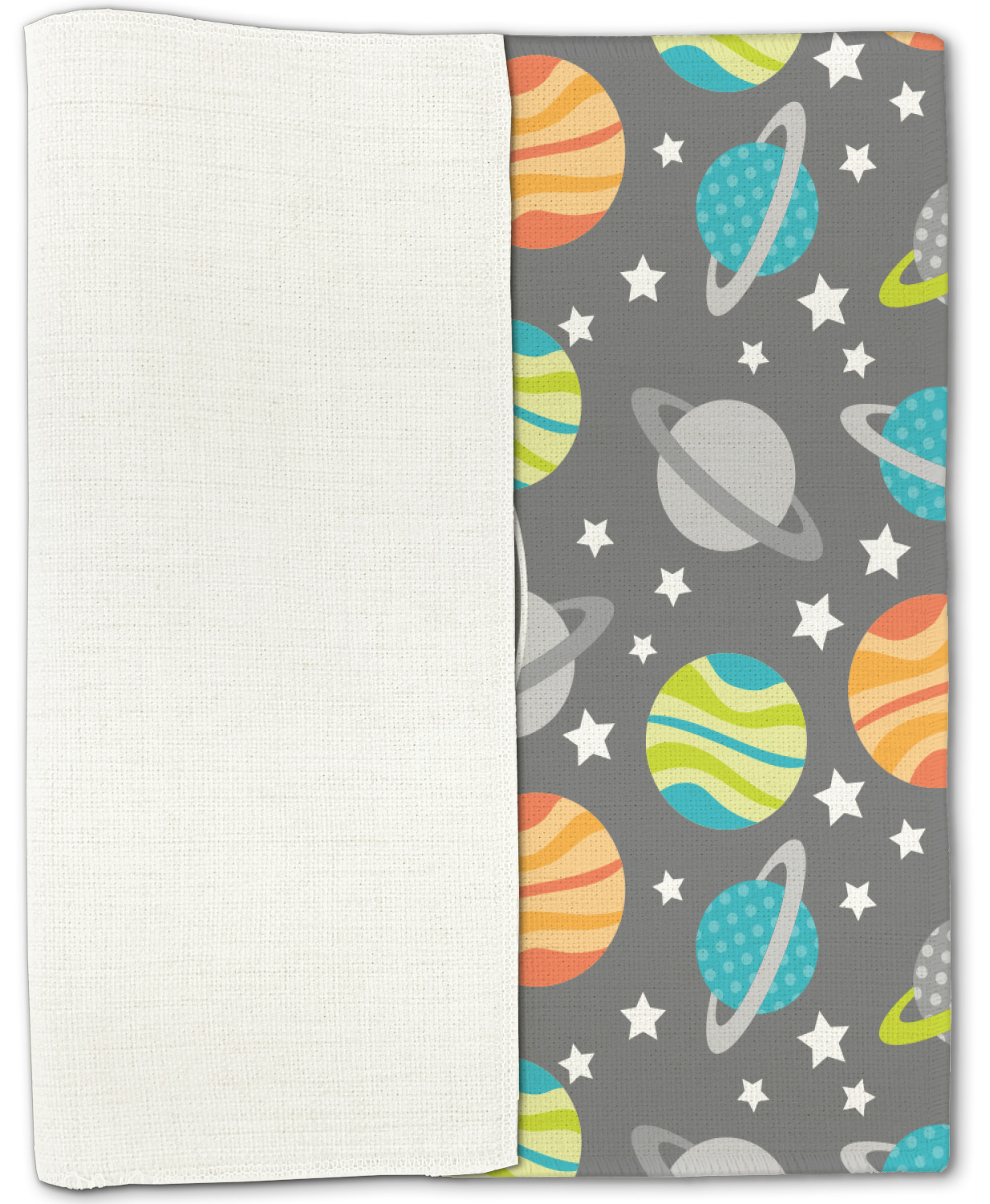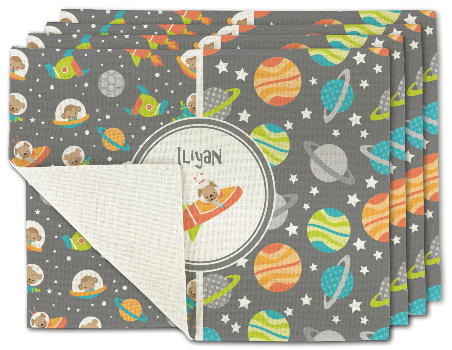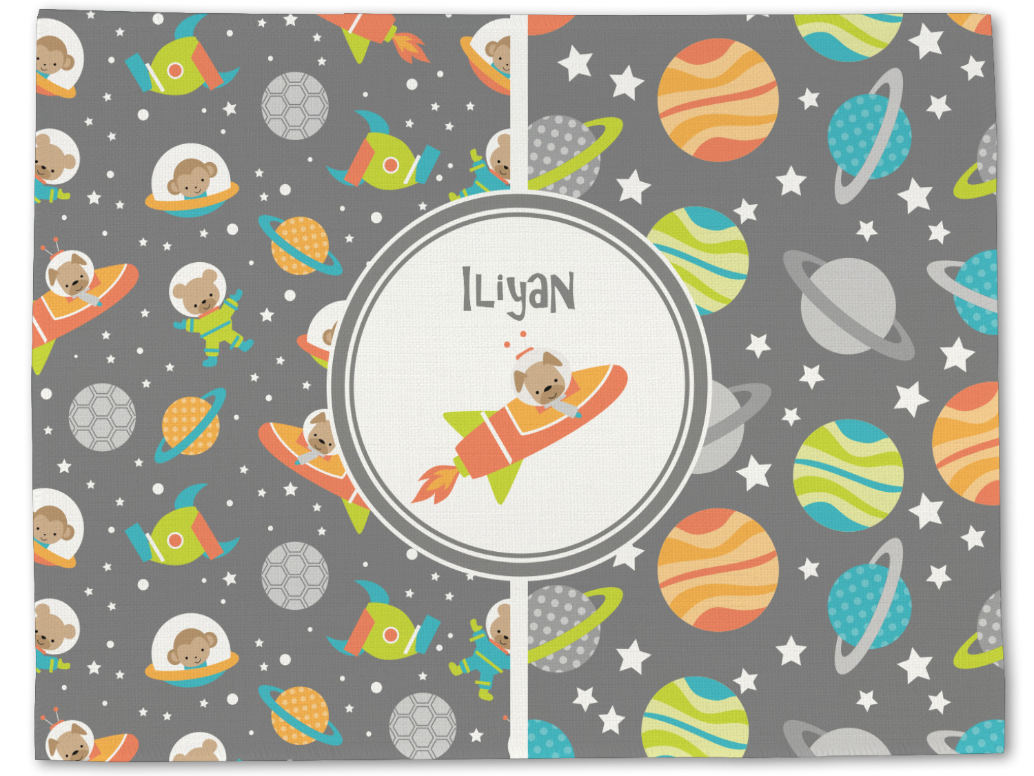 The design is filled with adorable little animal friends in space suits and space ships! On the other side, there are cute little coordinating planets! The bright colors on the animals and planets make for a great contrast to the dark grey background.