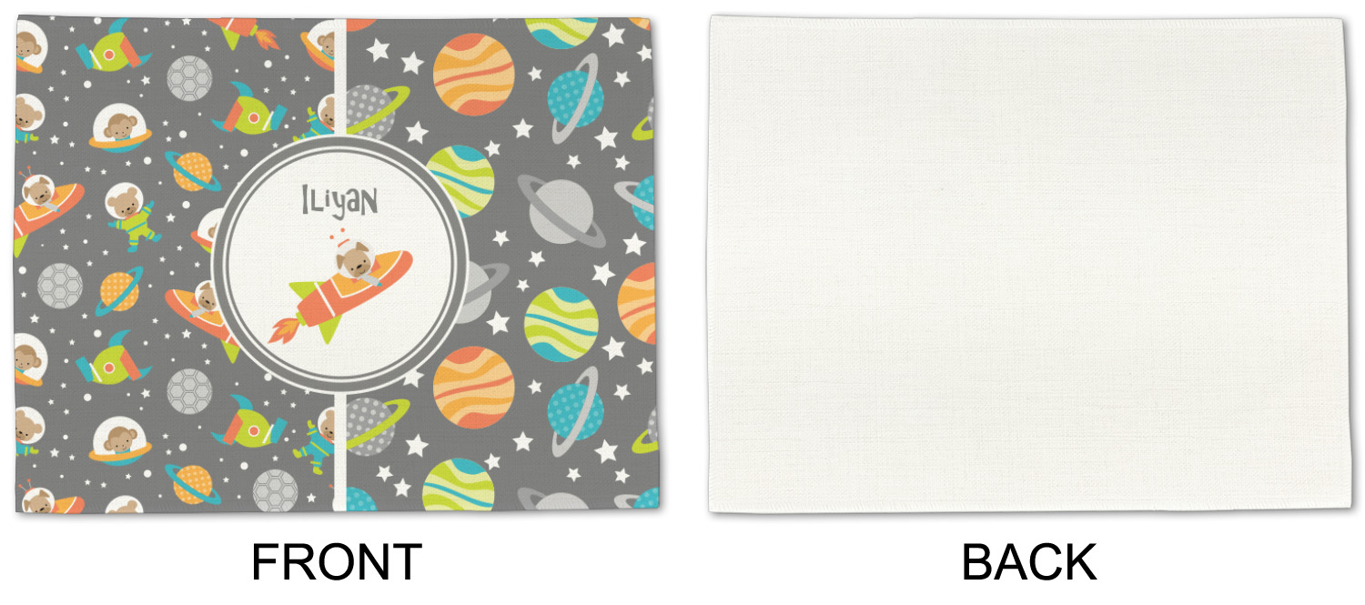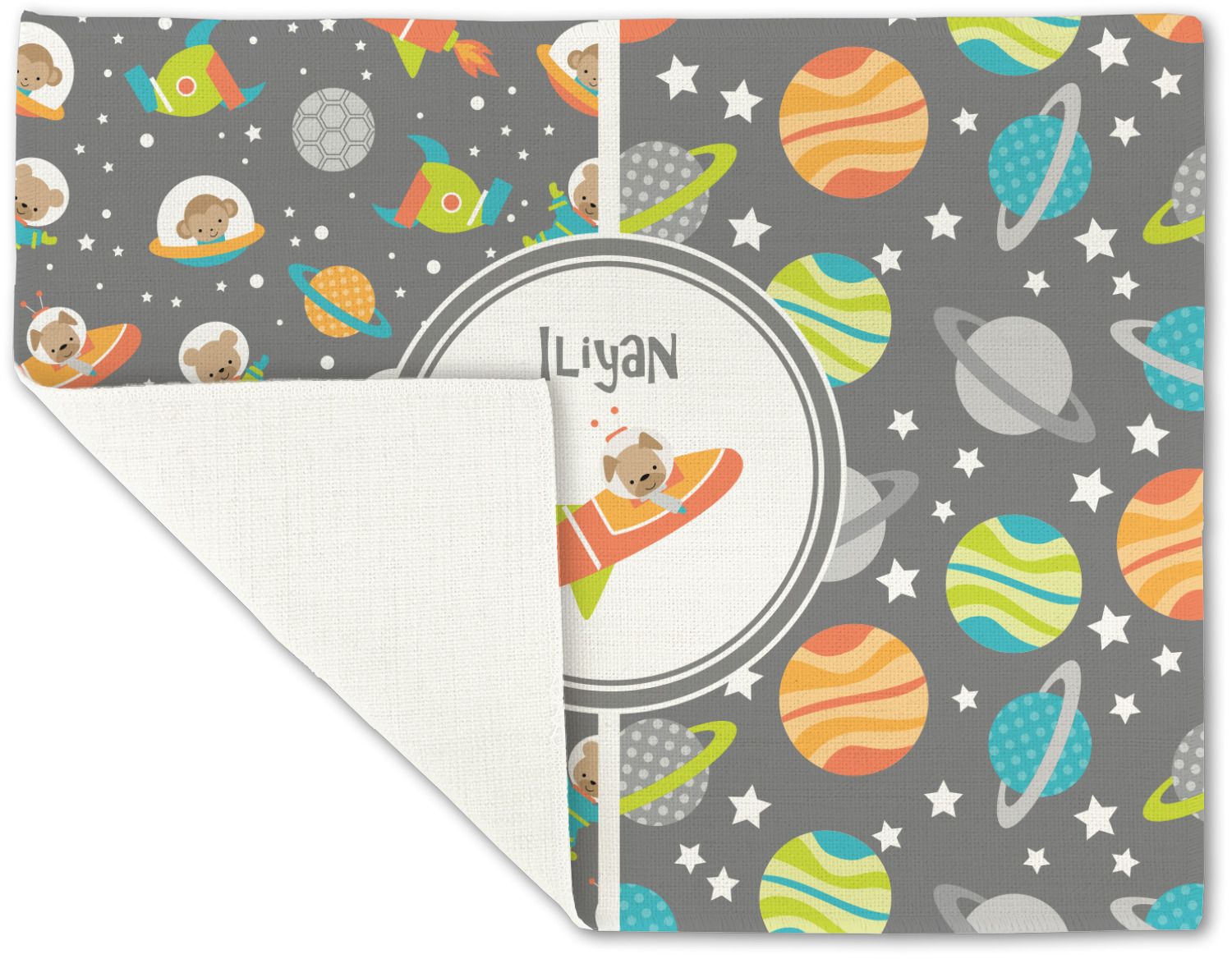 The design is filled with adorable little animal friends in space suits and space ships! On the other side, there are cute little coordinating planets! The bright colors on the animals and planets make for a great contrast to the dark grey background.