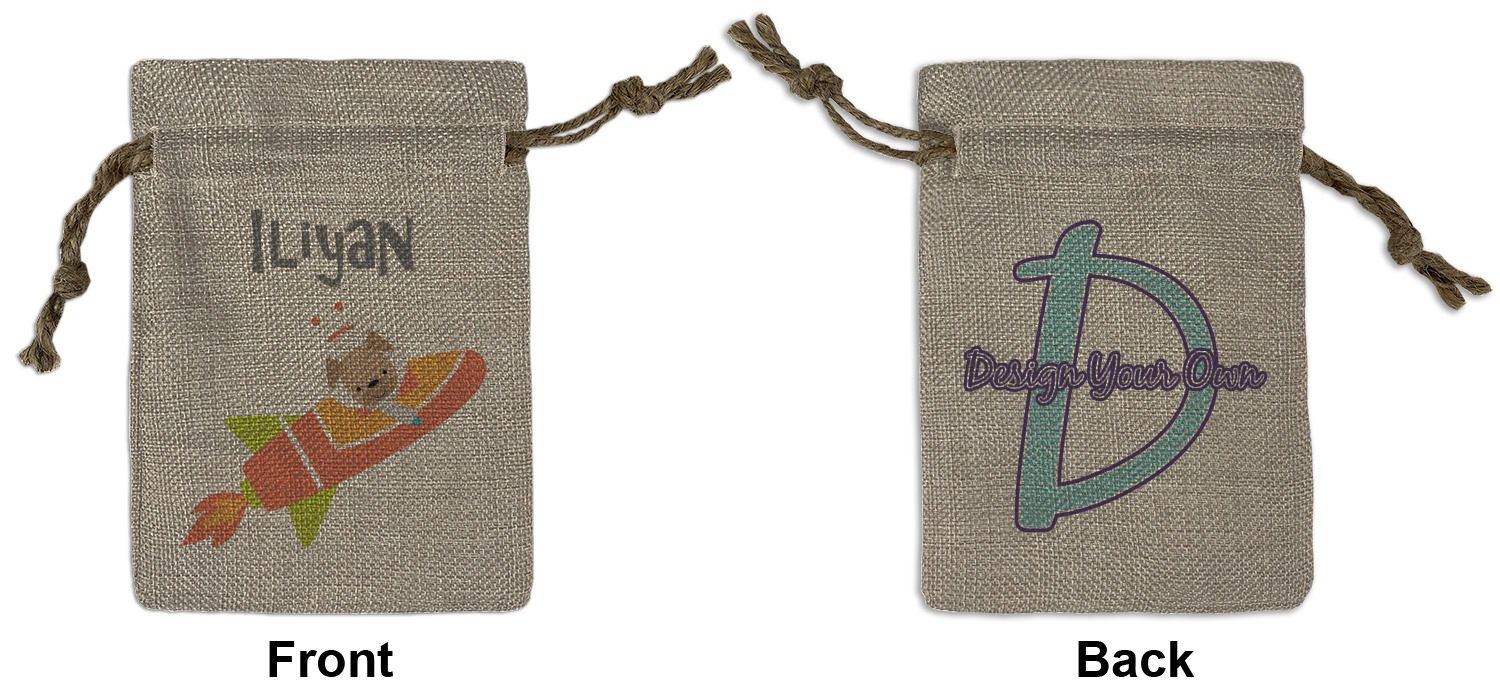 We sell our Burlap Gift Bags in 3 variant sized bags. Made with burlap polyester, each personalized bag can be secured with a twine drawstring pull. Your custom design is available to print on one side or both sides - completely up to you! The sizes of the bags measure approximately 4.5" x 6.5" for the smallest size, 6.5" x 8.0" for the medium size, and 6.5" x 13.5" for the large-sized bag.