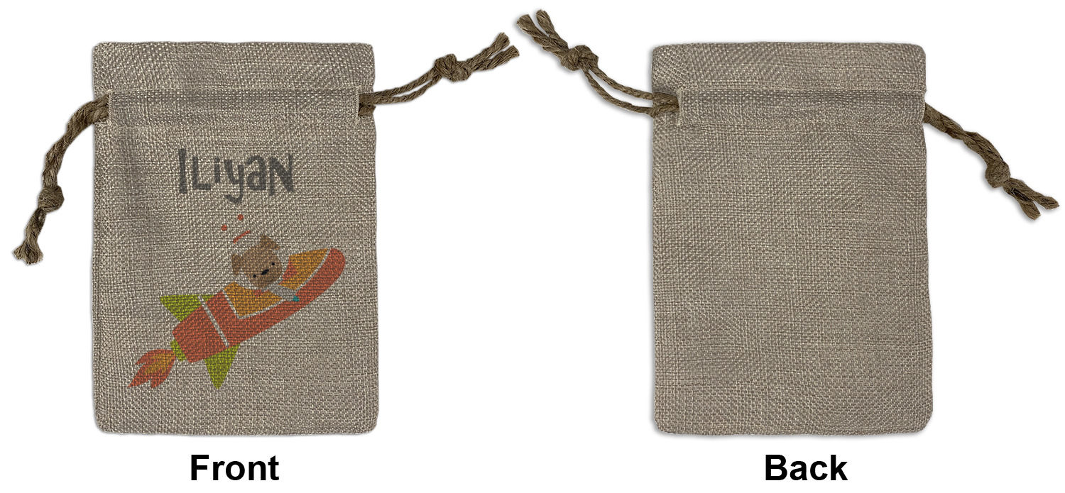 We sell our Burlap Gift Bags in 3 variant sized bags. Made with burlap polyester, each personalized bag can be secured with a twine drawstring pull. Your custom design is available to print on one side or both sides - completely up to you! The sizes of the bags measure approximately 4.5" x 6.5" for the smallest size, 6.5" x 8.0" for the medium size, and 6.5" x 13.5" for the large-sized bag.