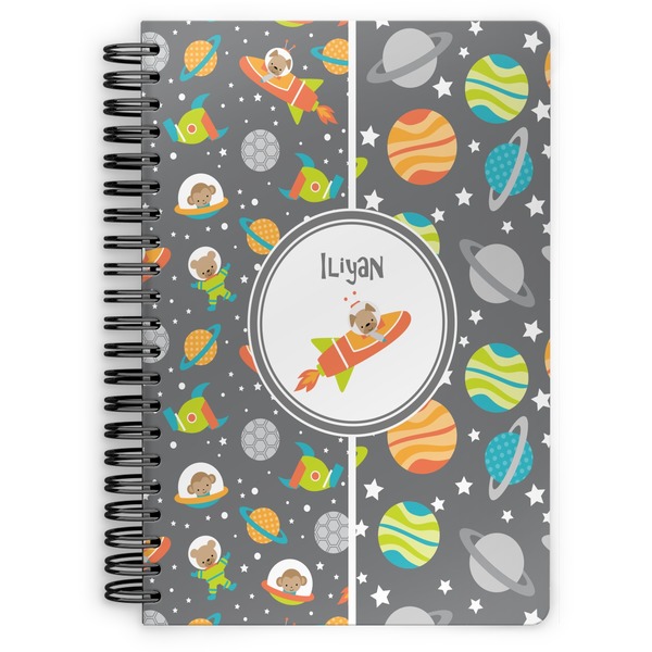This spiral notebook includes 75 sheets of thick, ruled paper. The front and back of this custom notebook is made of a robust, laminate, plastic covering. We print your personalization on these two panels, underneath a glossy finish, which emphasizes the colors of your design. The two panels and the sheets of paper are held together by a sturdy, black coil. The paper within your bound notebook is perforated for easy, clean tearing.