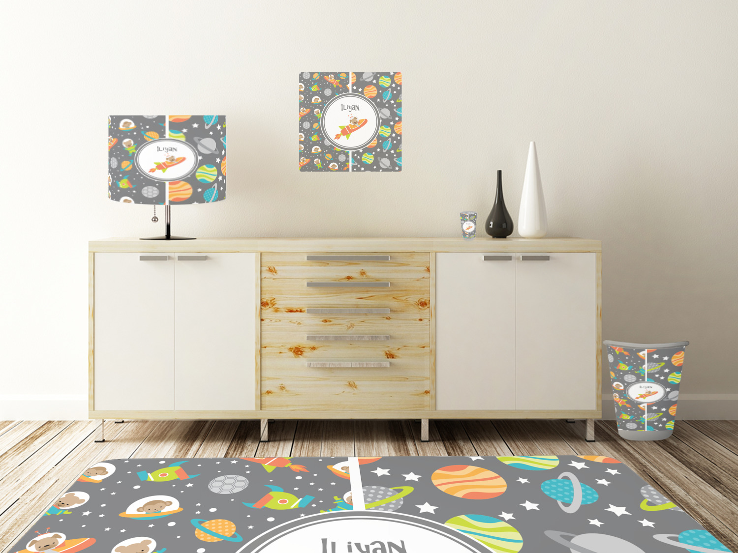 The design is filled with adorable little animal friends in space suits and space ships! On the other side, there are cute little coordinating planets! The bright colors on the animals and planets make for a great contrast to the dark grey background.