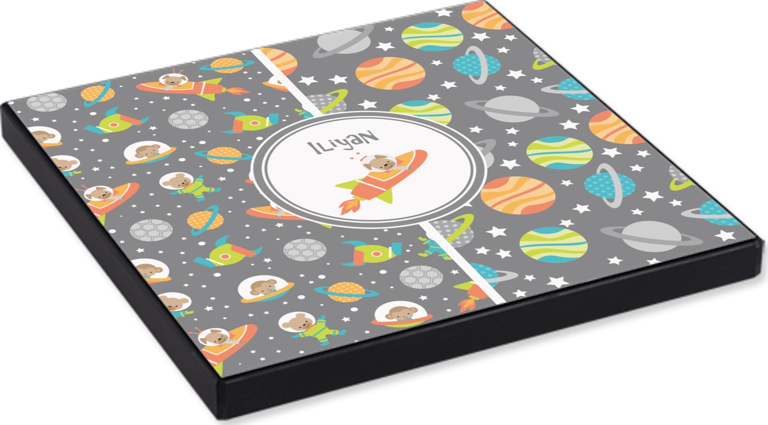 The design is filled with adorable little animal friends in space suits and space ships! On the other side, there are cute little coordinating planets! The bright colors on the animals and planets make for a great contrast to the dark grey background.