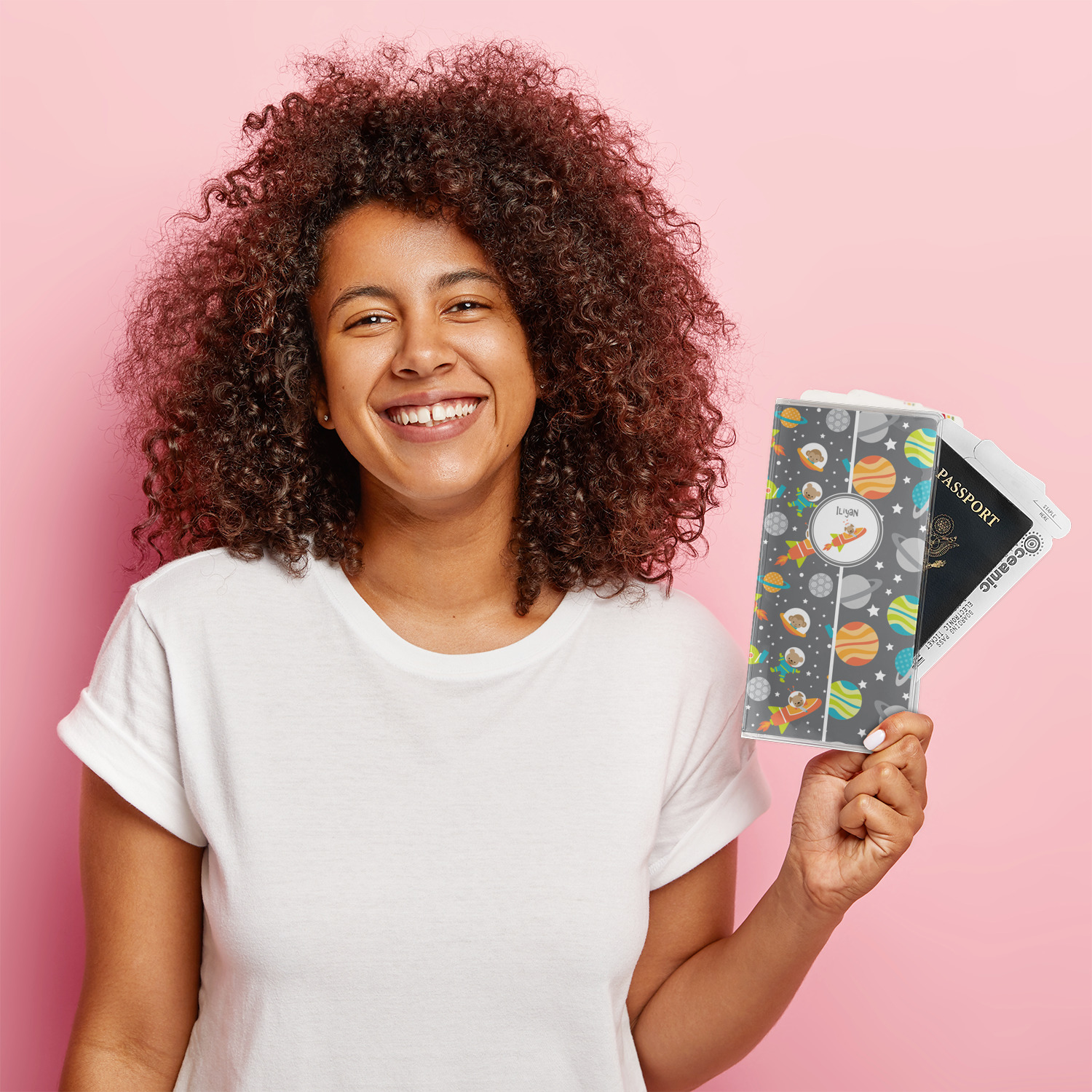 This document holder is really sturdy and has your personalized design inserted right behind all of your nifty pockets, so you can see it on the front and back covers. There are two large pockets and two shorter pockets inside. The larger pockets are tall enough to keep your boarding pass nice and straight. The smaller pockets (on top of the large pockets) are large enough to fit your passport, credit card, or ID.