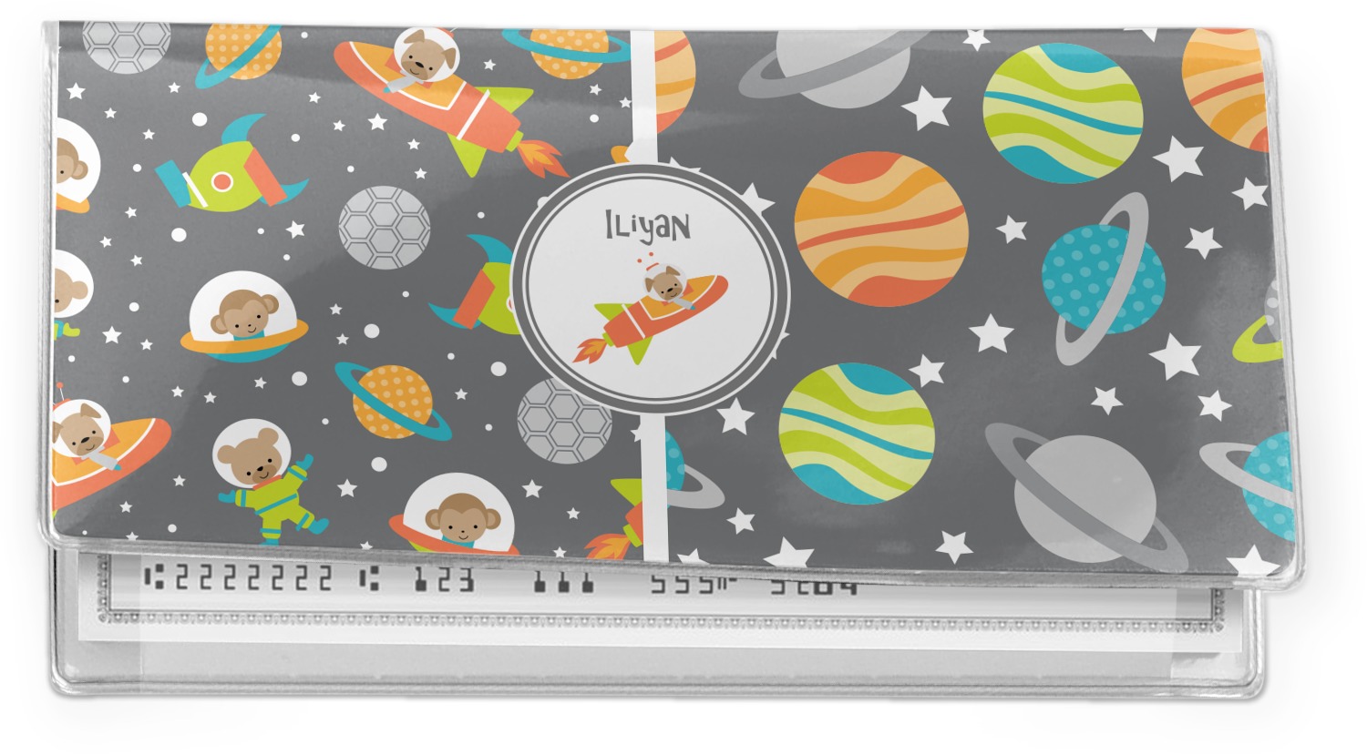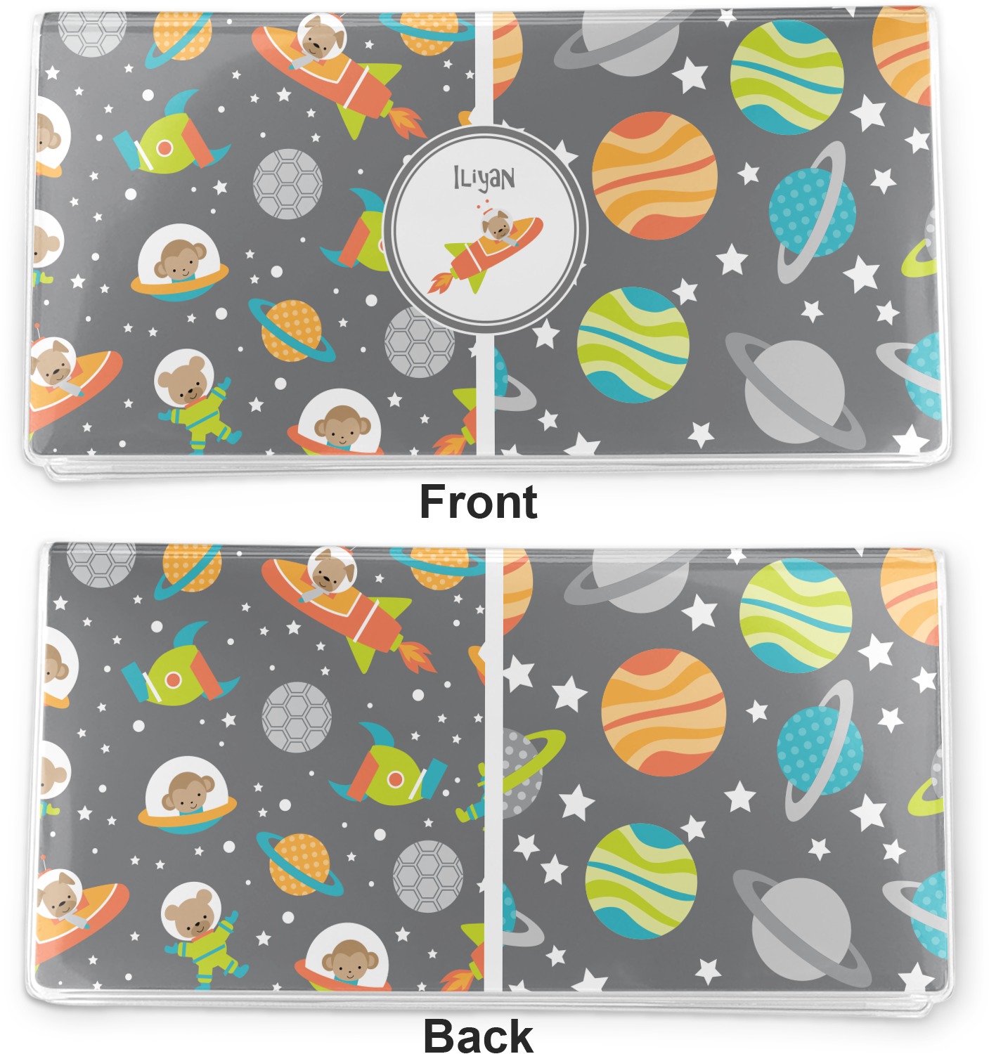 The design is filled with adorable little animal friends in space suits and space ships! On the other side, there are cute little coordinating planets! The bright colors on the animals and planets make for a great contrast to the dark grey background.