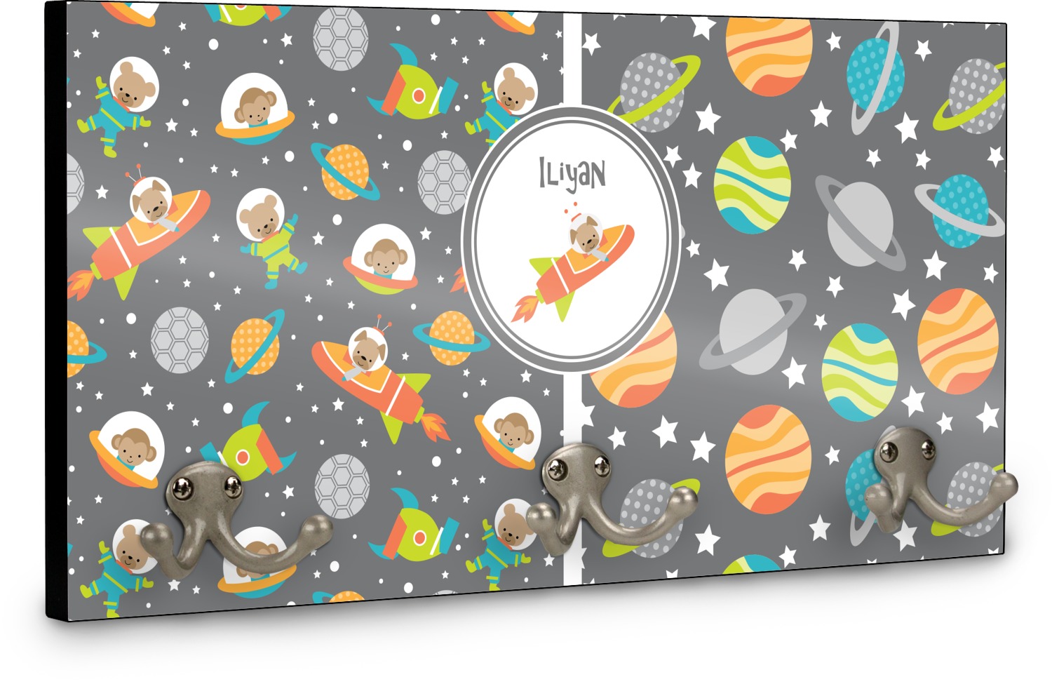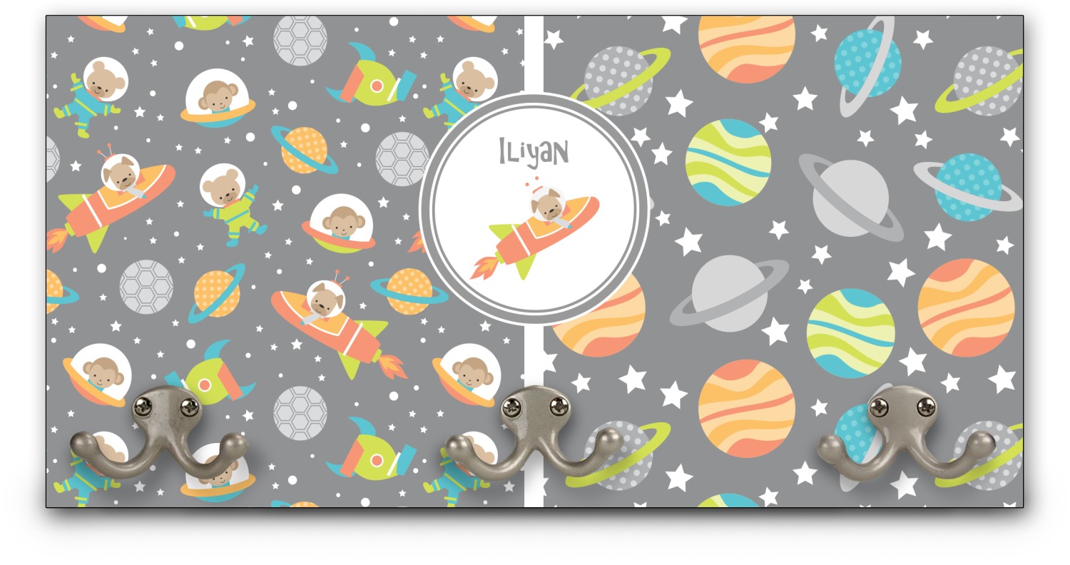 This coat rack is the perfect way to add some personality to your wall or entryway. The board is made of a strong maple that is approximately 16" x 8". The three 2-prong hooks are a sturdy metal that have three screws attaching them to the board. Your design is printed right onto the front of the board while the back and sides are a simple black.