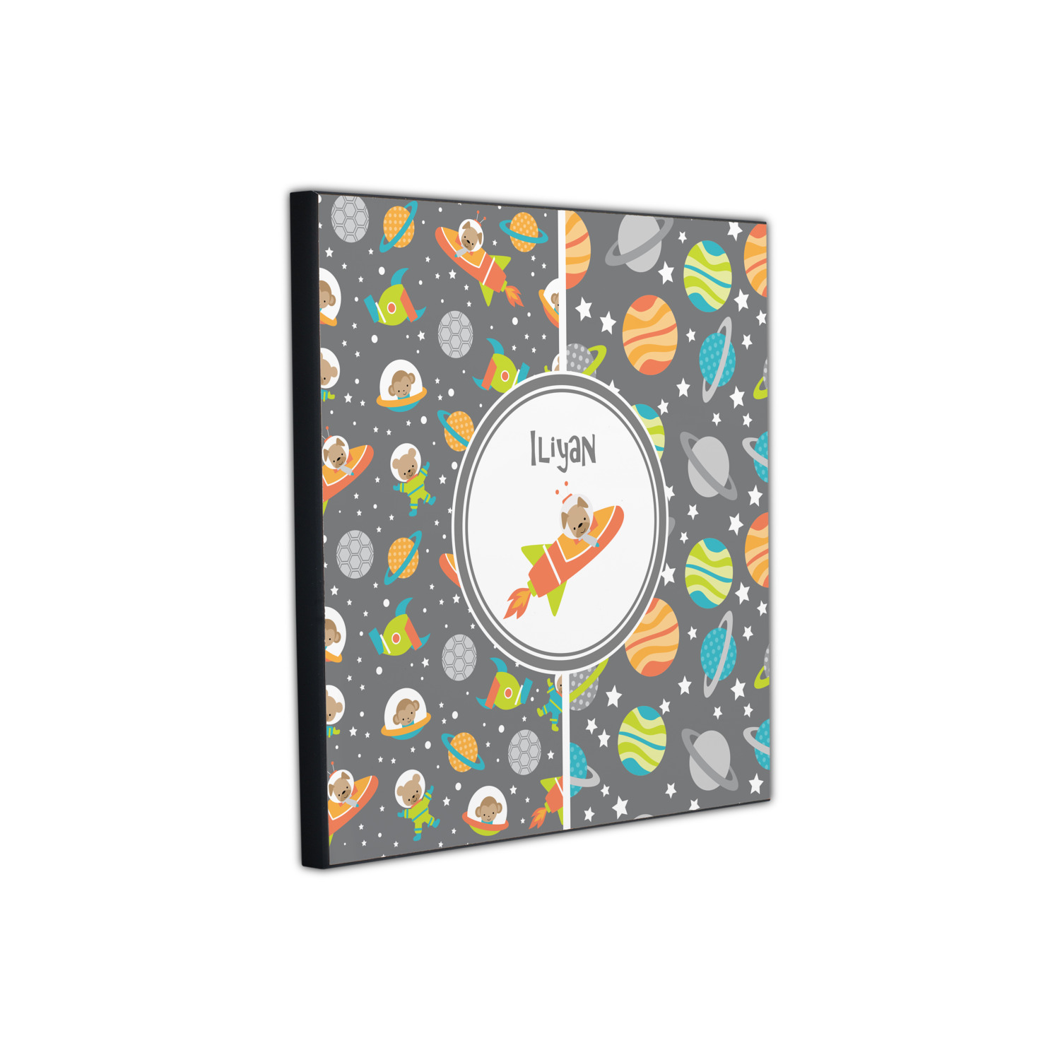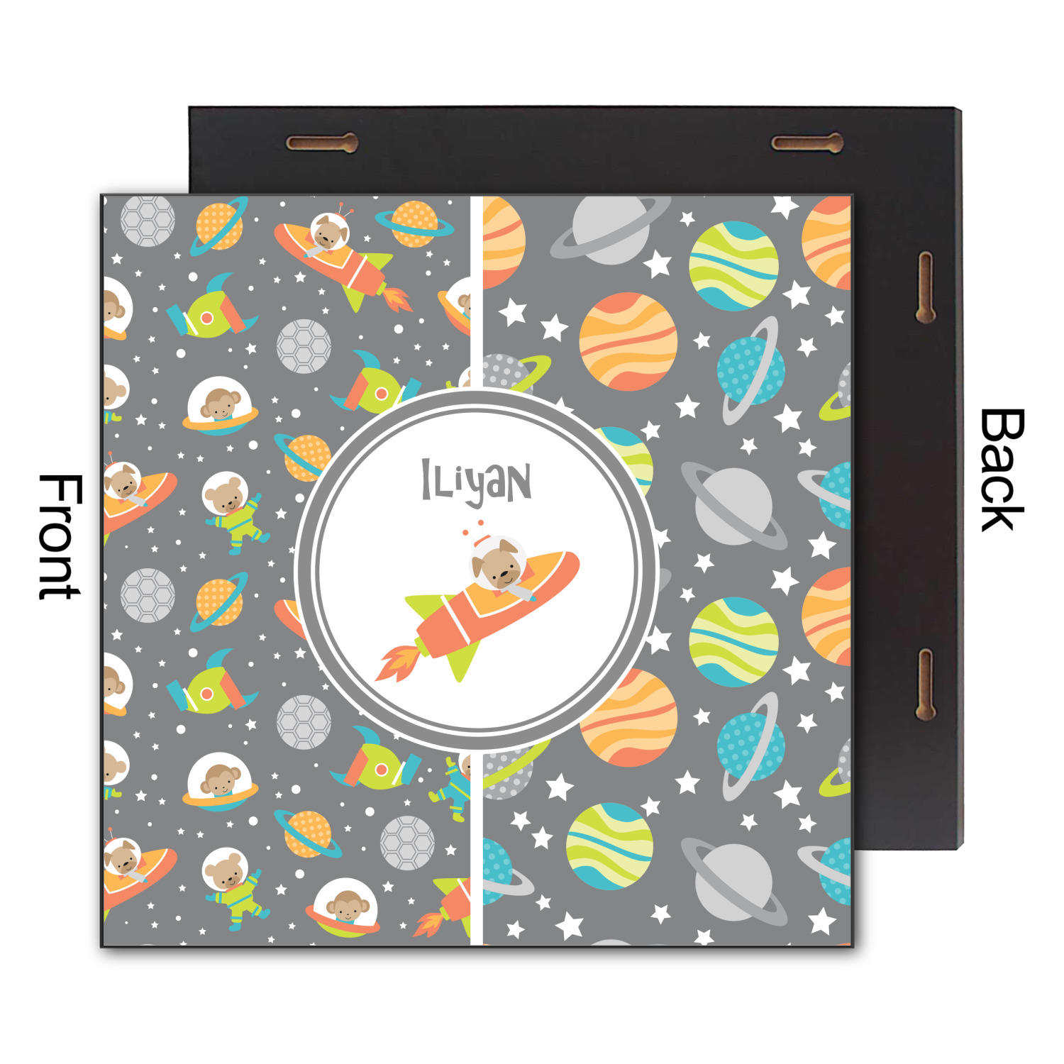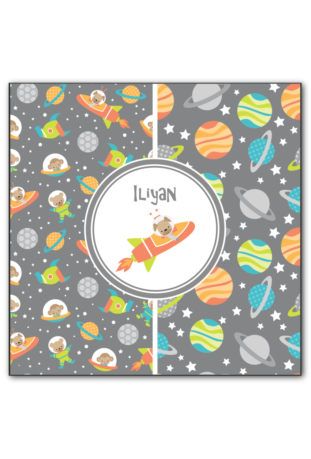 The design is filled with adorable little animal friends in space suits and space ships! On the other side, there are cute little coordinating planets! The bright colors on the animals and planets make for a great contrast to the dark grey background.