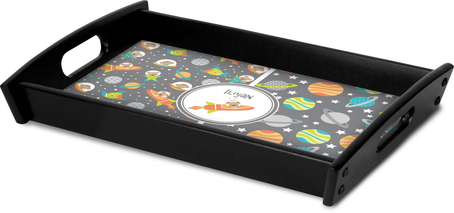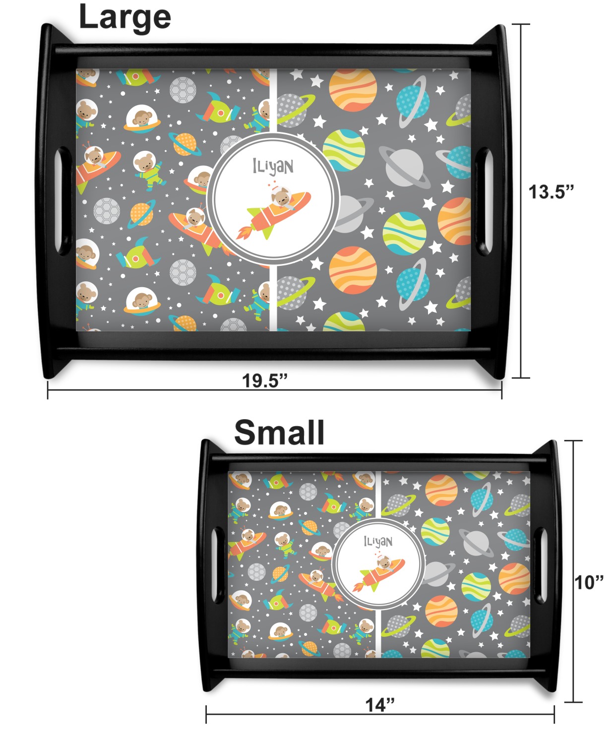 This serving tray with handles features square edges and two rounded sides, creating a very modern look. Each side is fabricated from a beautifully cut, natural wood. The bottom of the interior of the tray displays your customized design in bright, vibrant color. The tray is sold in both a black color and a natural wood look. Each variation of the wood serving tray has two sizes: Small, which is 14" x 10" x 2.25", and Large, which is 19.5" x 13.5" x 2.75".