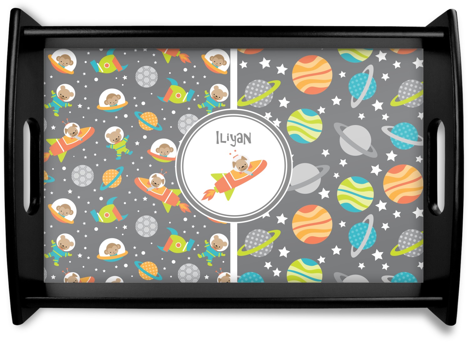 The design is filled with adorable little animal friends in space suits and space ships! On the other side, there are cute little coordinating planets! The bright colors on the animals and planets make for a great contrast to the dark grey background.