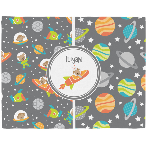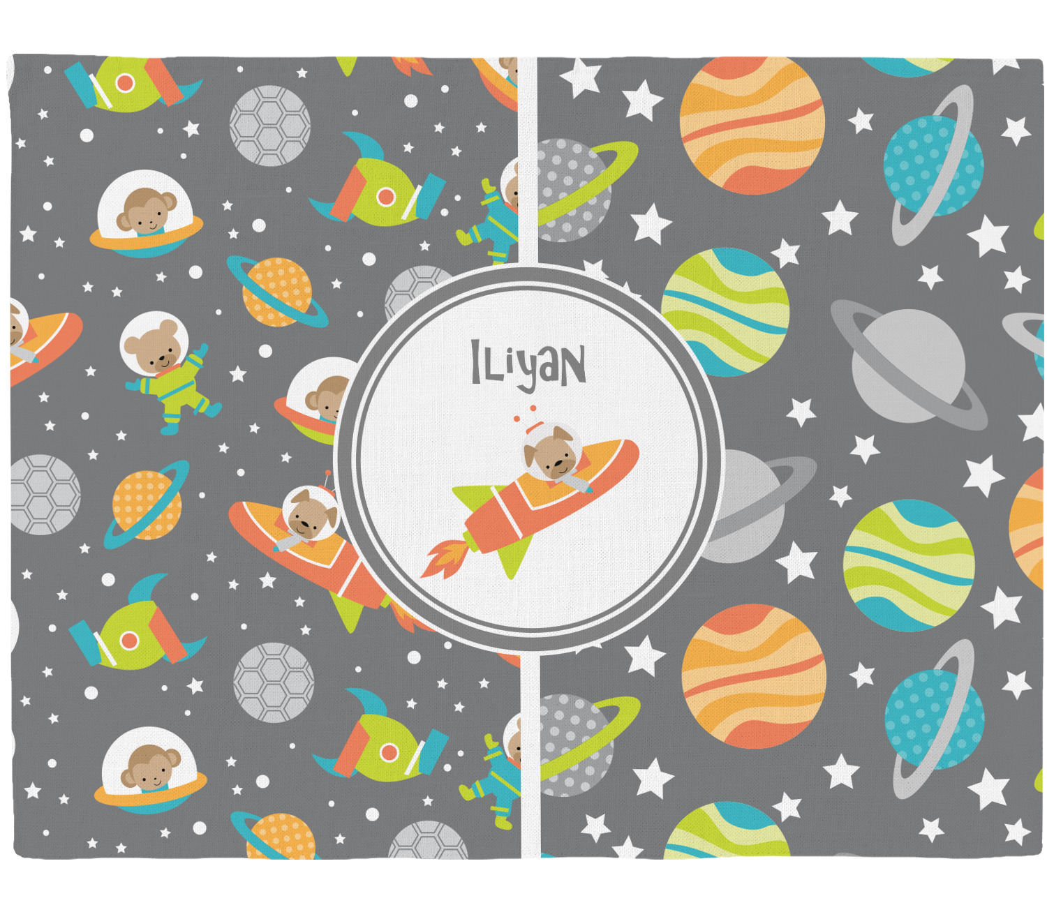 The design is filled with adorable little animal friends in space suits and space ships! On the other side, there are cute little coordinating planets! The bright colors on the animals and planets make for a great contrast to the dark grey background.