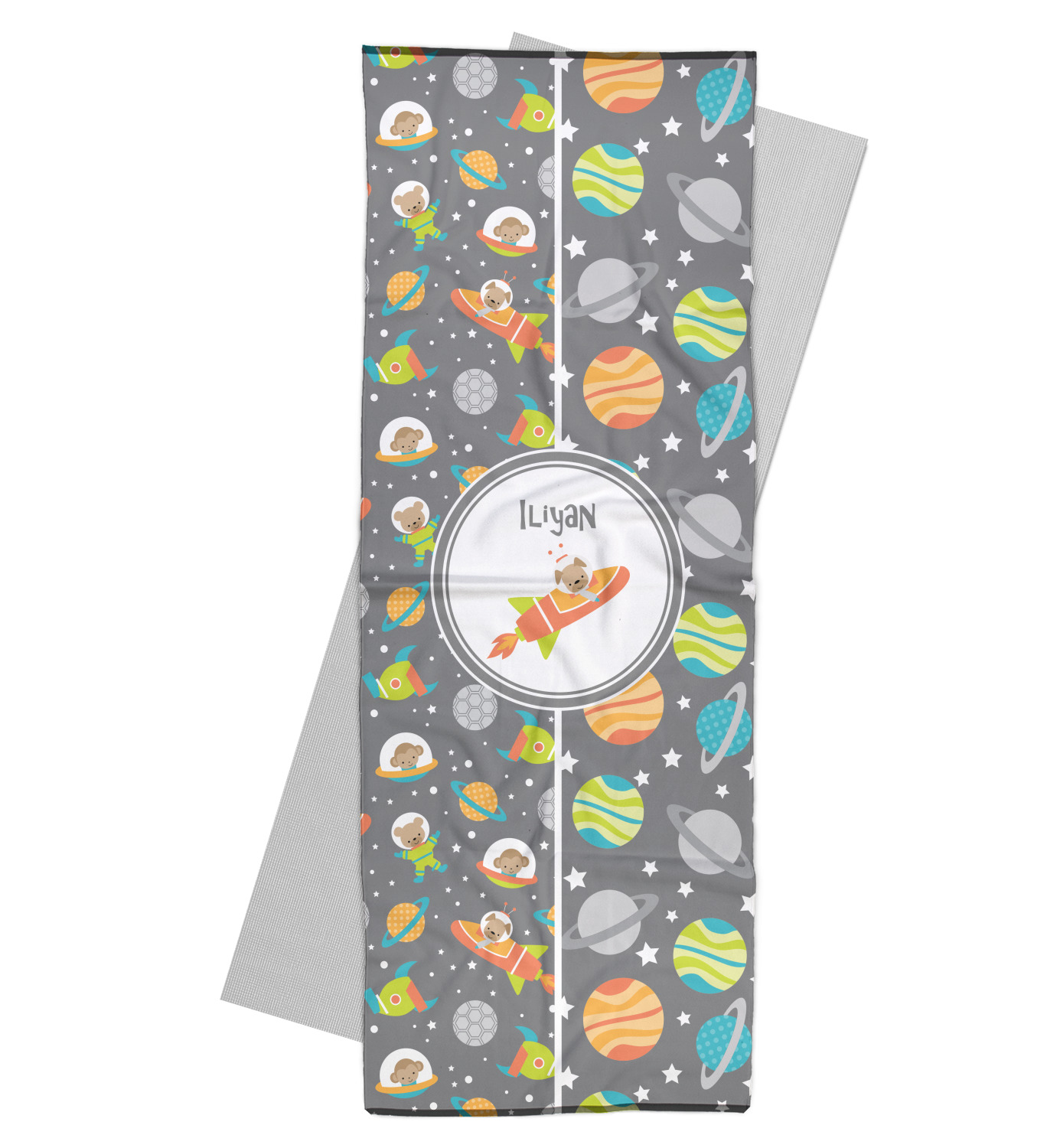 The design is filled with adorable little animal friends in space suits and space ships! On the other side, there are cute little coordinating planets! The bright colors on the animals and planets make for a great contrast to the dark grey background.