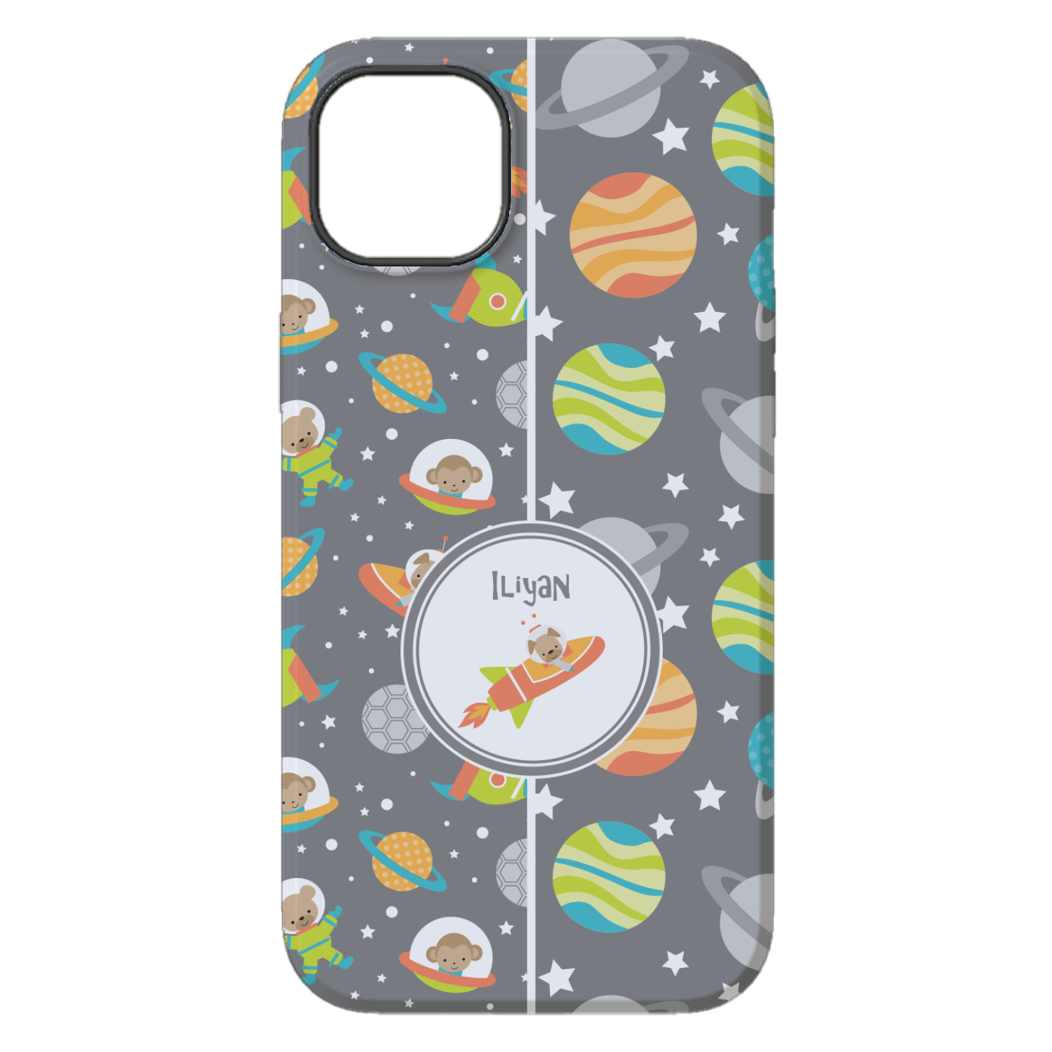 The design is filled with adorable little animal friends in space suits and space ships! On the other side, there are cute little coordinating planets! The bright colors on the animals and planets make for a great contrast to the dark grey background.