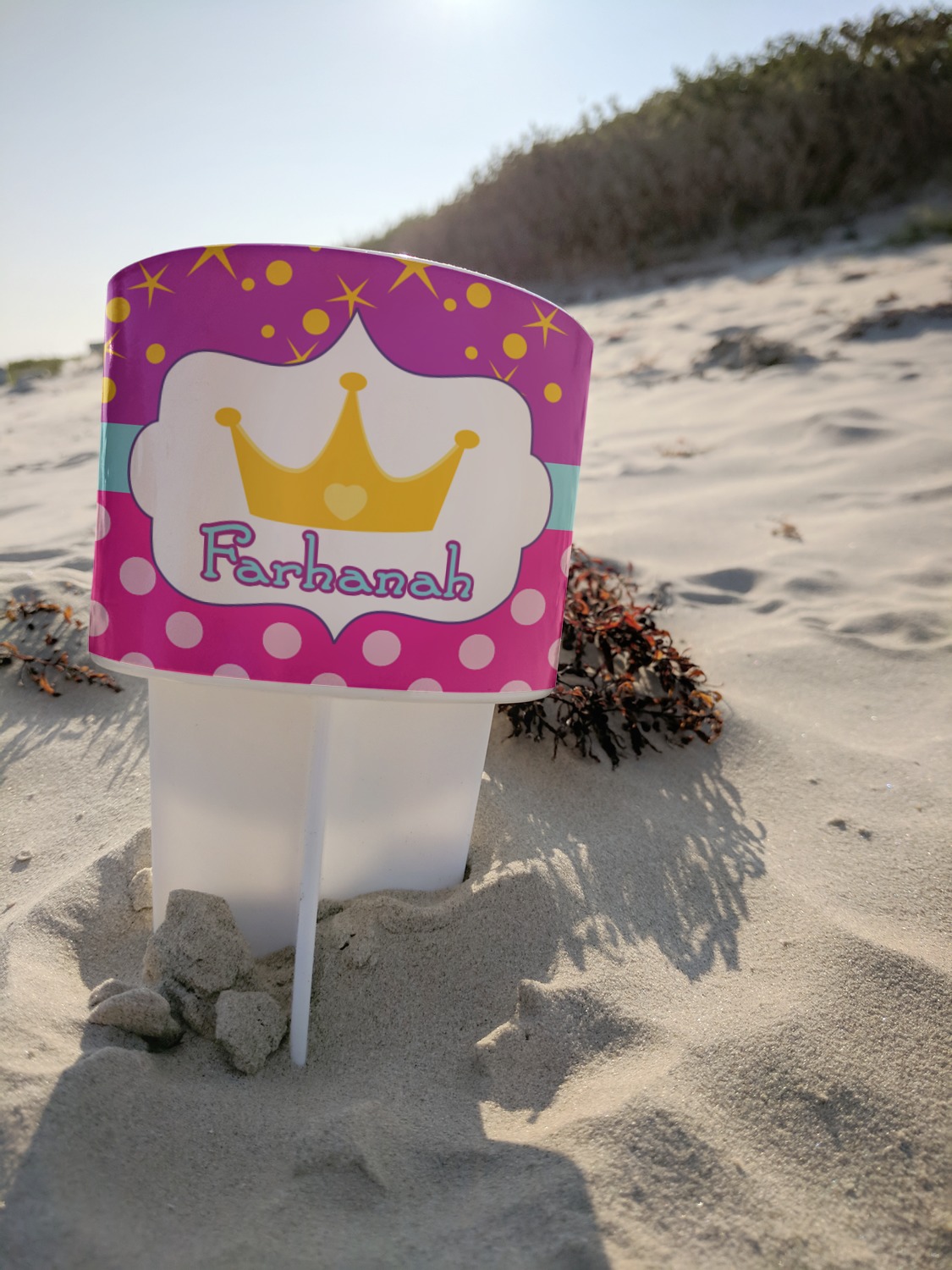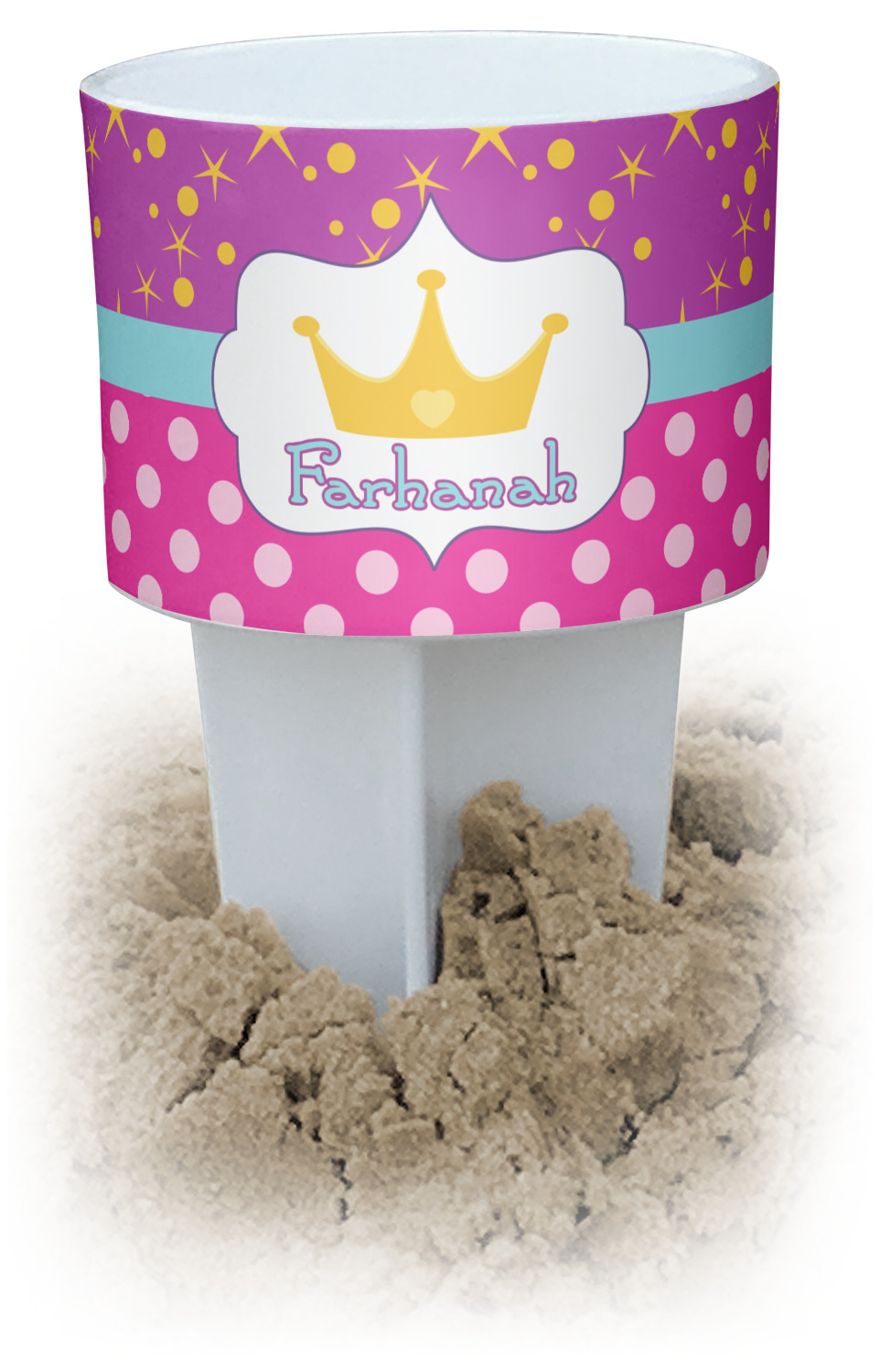 This cup holder has a large stake at its bottom that anchors it to the sand or ground below, while the cup holder rests above the stake. The entire drink holder is made of durable plastic and displays your customization around the cup holder portion. We sell these personalized beach spikers in two different colors: black and white.
