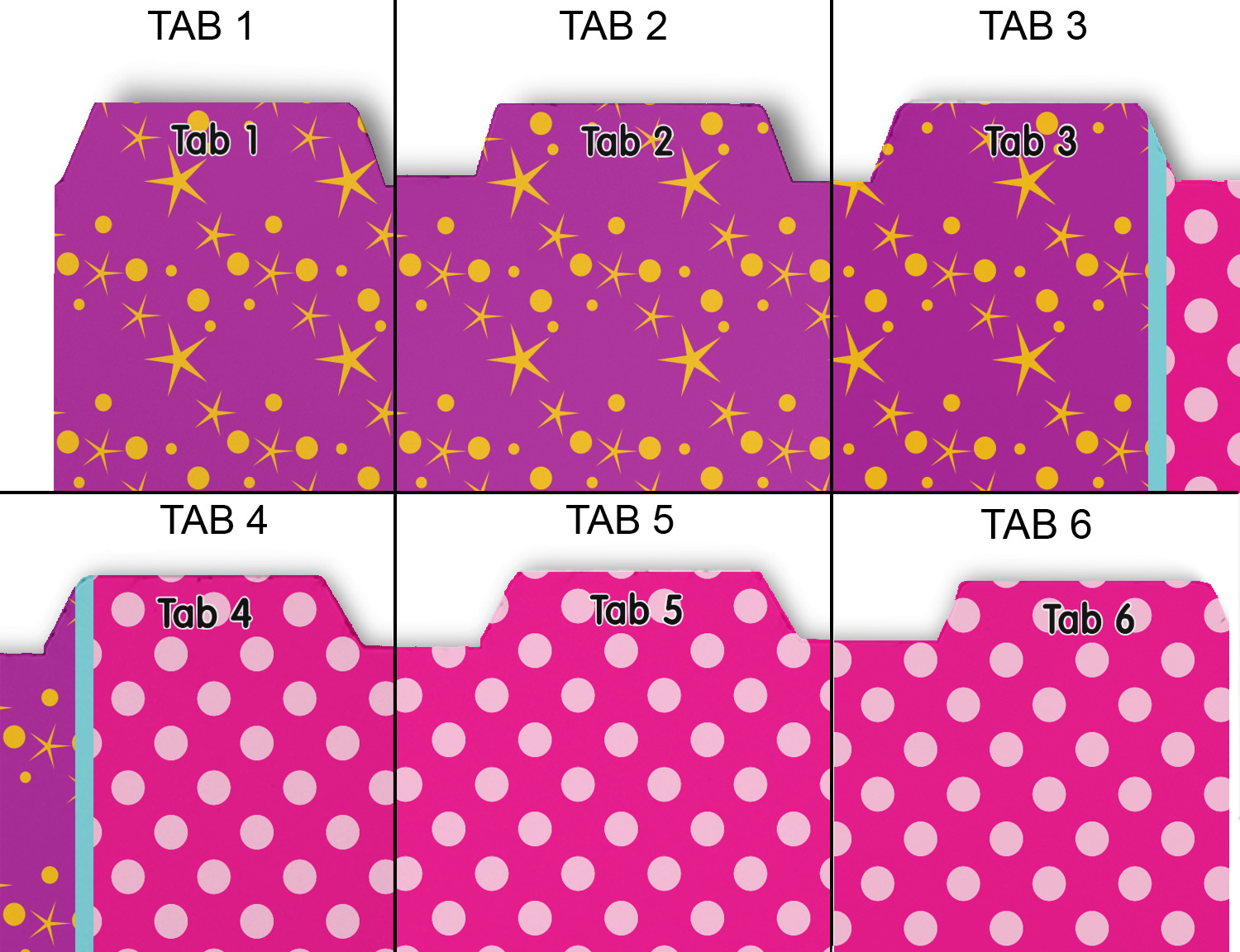 Whether you use binders at school or at work, we have designs to suit all of them. Available in 5 or 6 tab sets, you are sure to find a set to suit your needs. The back of each one is white and can be used to take notes, write vital information on, etc.
