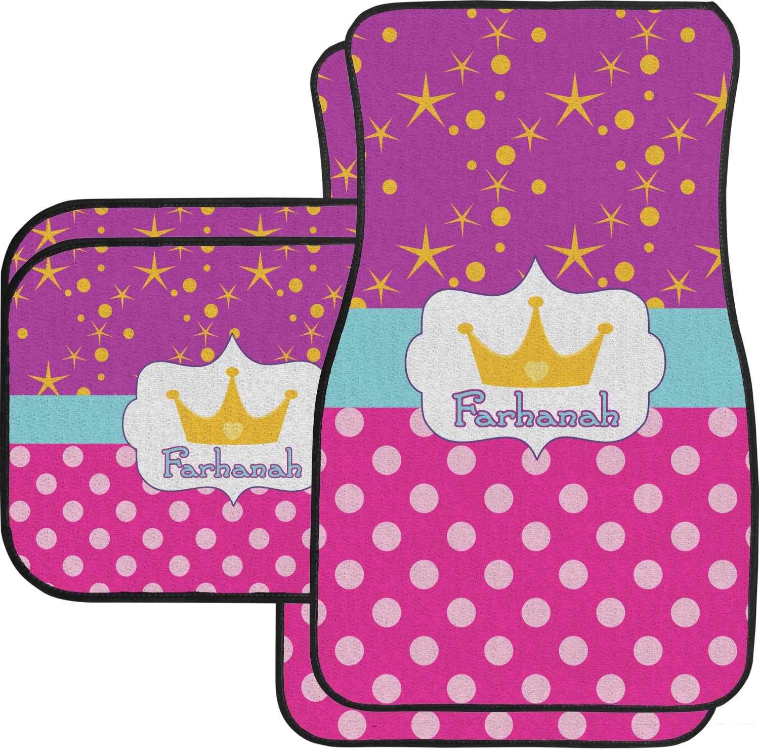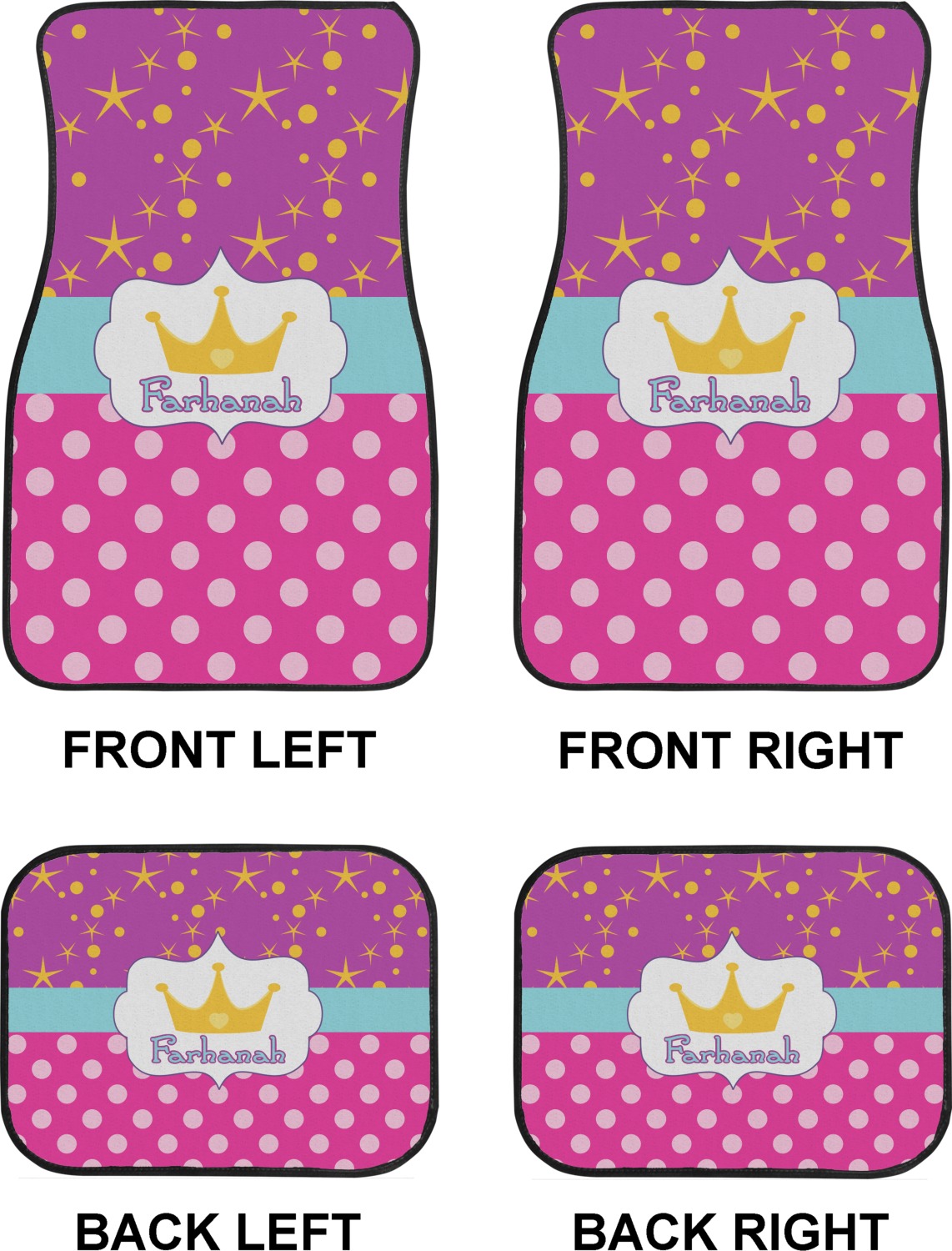 We craft our auto floor mats mats from polyester, apply a black finish to the edges, and lined at the bottom to prevent slippage. These mats protect your floors from grass, mud, and any accidental spills. We display your personalized design on the front face of each mat. The sizes of these car floor liners are standardized to provide a versatile fit for all vehicles. The front rows car mats measure at 17 by 26.5 inches, while the back rows measure at 17 by 13 inches. We sell three packages of car floor mats. You can purchase a pair of front row car mats, a pair of back row car mats, or a set of front row and back row car mats. To make an informed purchase, we recommend measuring the surface area of your car floors.