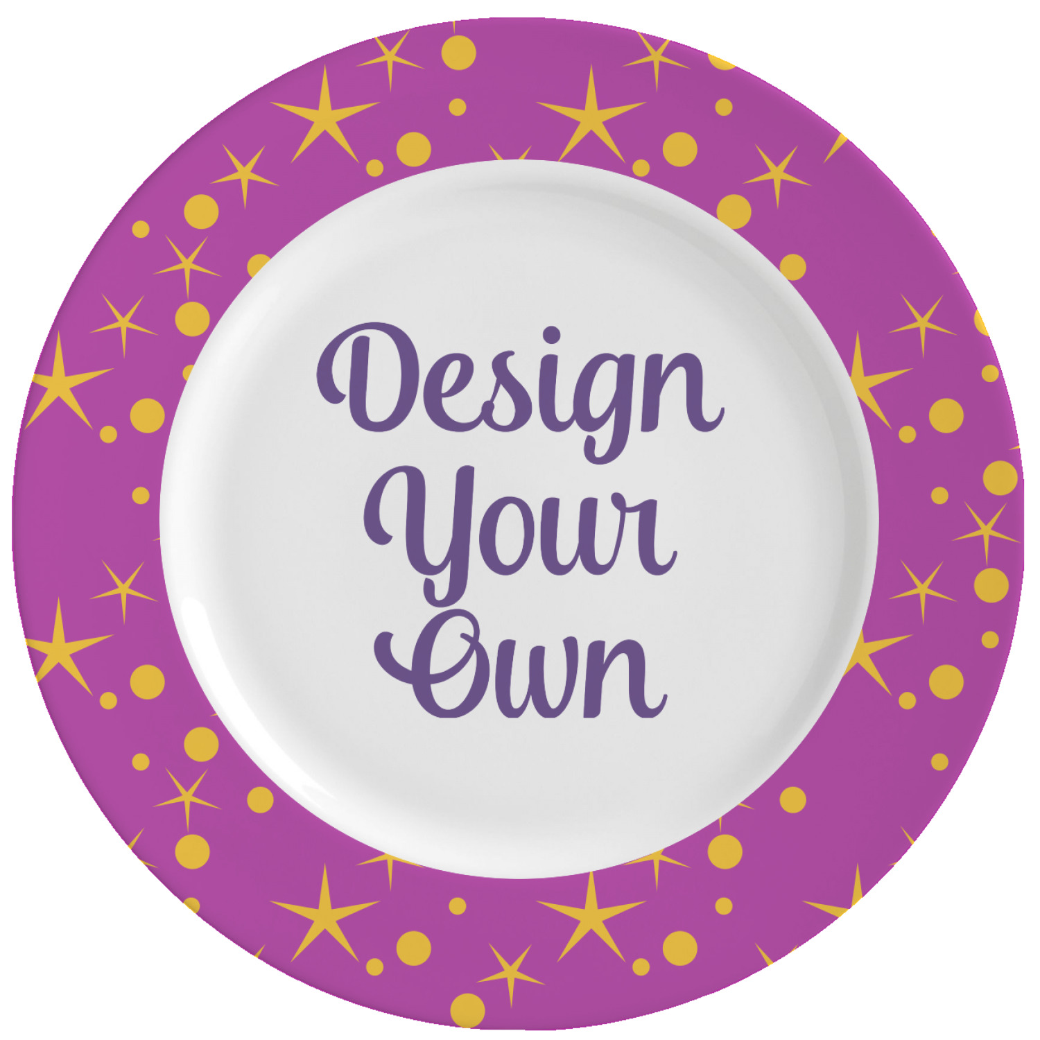 With this custom dinner plate, your have the option of personalizing the rim with an attractive pattern, and then displaying a name, graphic, or text in the center of the plate, against a white background. The exterior of this plate is also the same classic, white color. A glaze coats your plate, making your vividly colored design seem even more vibrant.