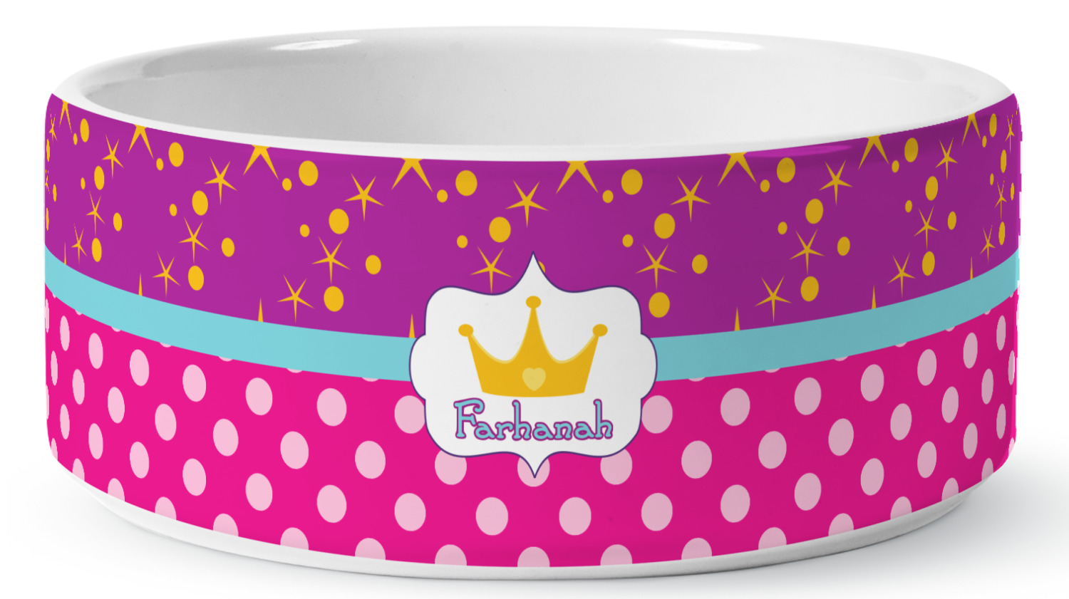 We carry these custom dog bowls in two available sizes: medium and large.The medium is 6 inches in diameter and 2.5 inches tall, and can therefore suit pets who eat up to 2.5 cups of food per meal. The large pet bowl is 7 inches in diameter and 3 inches tall, and suits pets who require up to 4.5 cups of food per meal.
