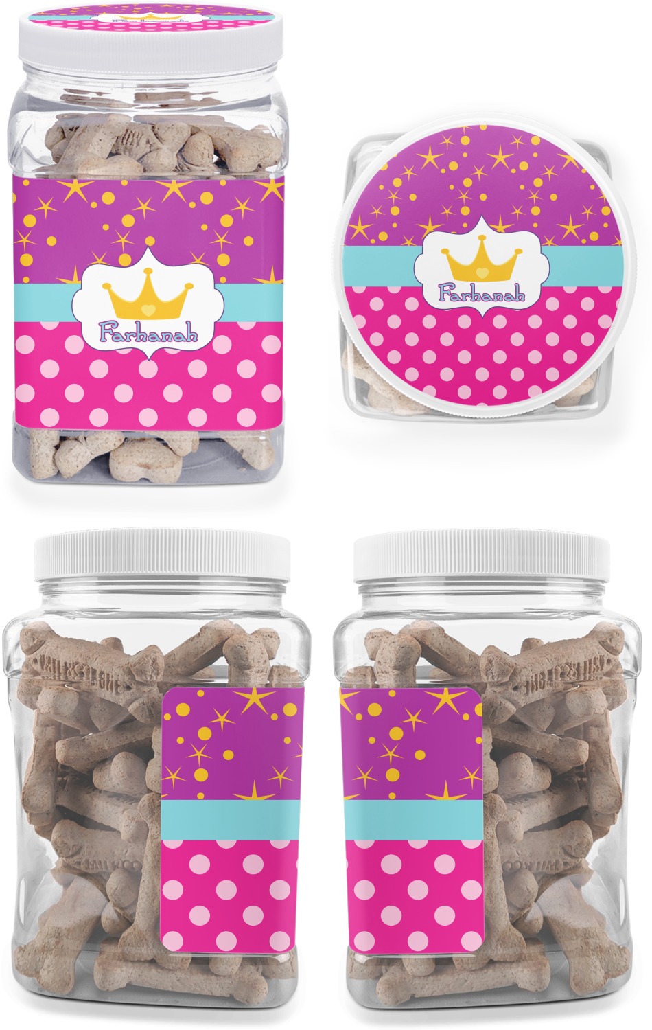 This half gallon jar, made from a sturdy plastic, is the perfect way to keep treats from any naughty pet paws, while still keeping them ready on hand for when your pup performs an impressive trick. This dog cookie jar features a screw-on, white lid that displays your personalized design on a vinyl sticker. We apply another customized sticker that wraps around the front and sides of the jar. Our dog treat jar also has indentations on the rear ends of the sides, which allows for convenient handling, and its square frame allows for easy storage.