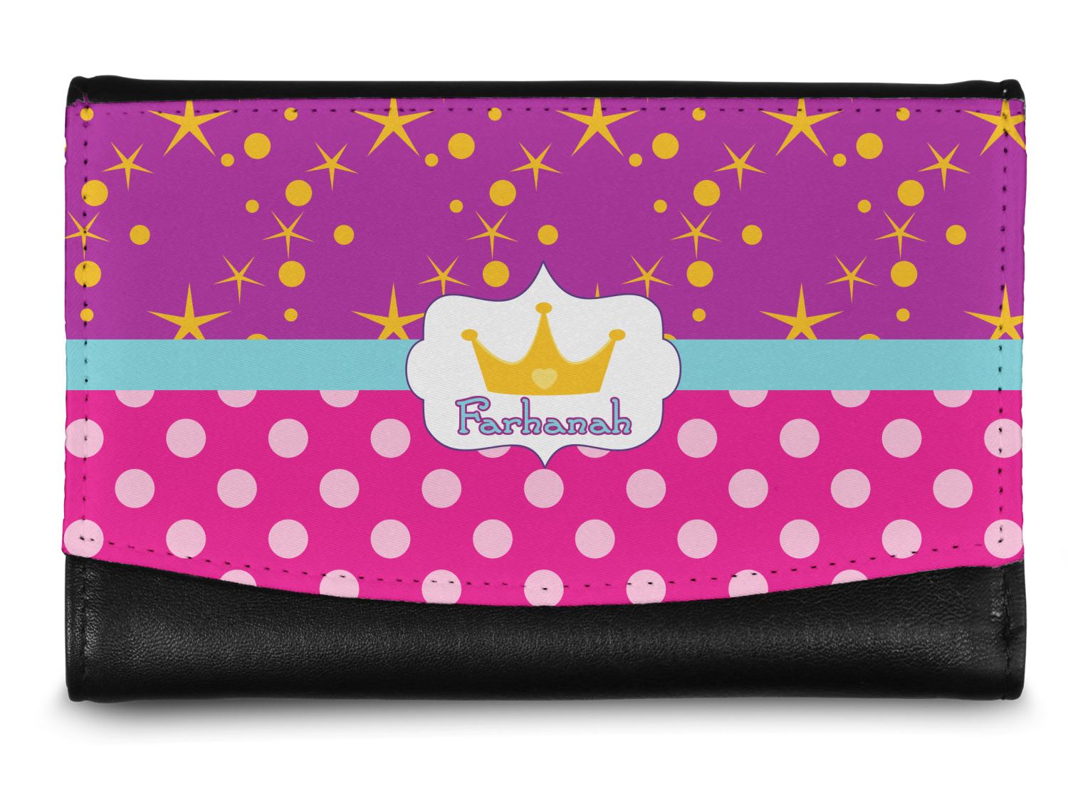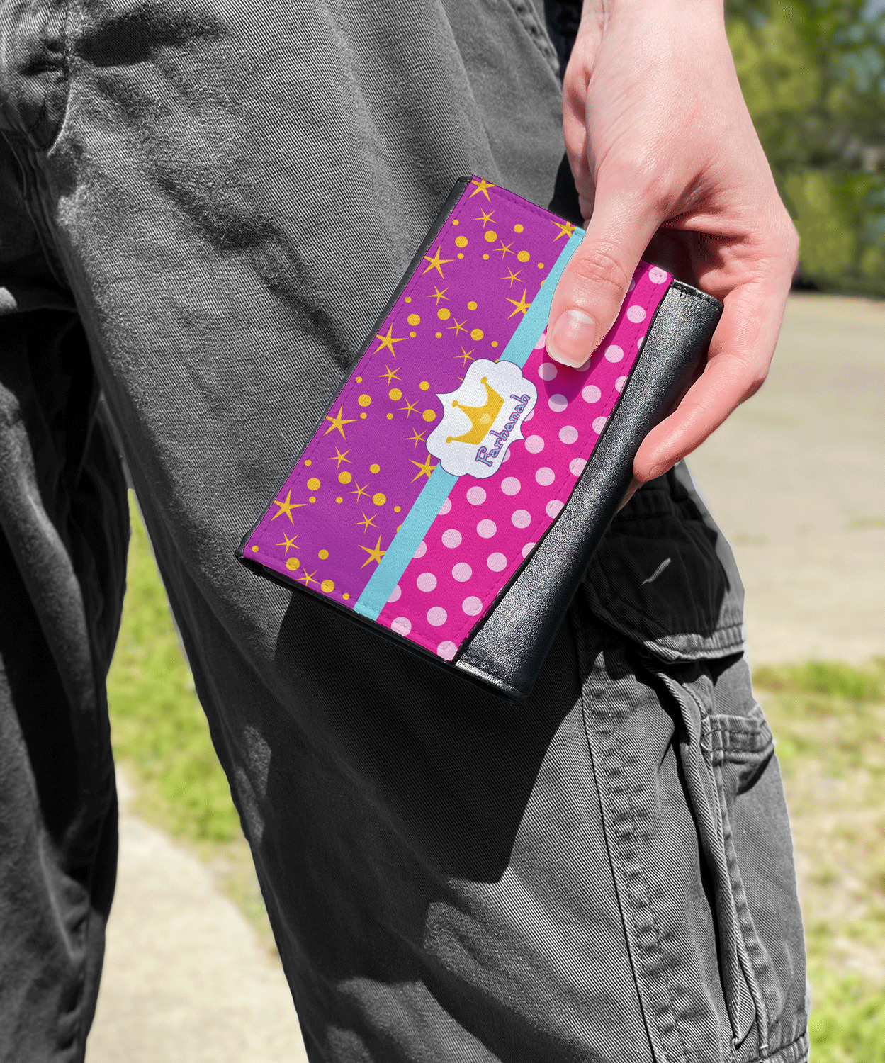 The compact size of this wallet - 5.5in wide, 3.5in tall and 0.75in thick when folded - makes it perfect to hold in hand and small enough to fit in a clutch or a normal size purse. The outside flap is customized with your choice of artwork and closes with a snap closure - with two different snaps to allow it to be adjusted when storing more items - to securely fasten the flap.
