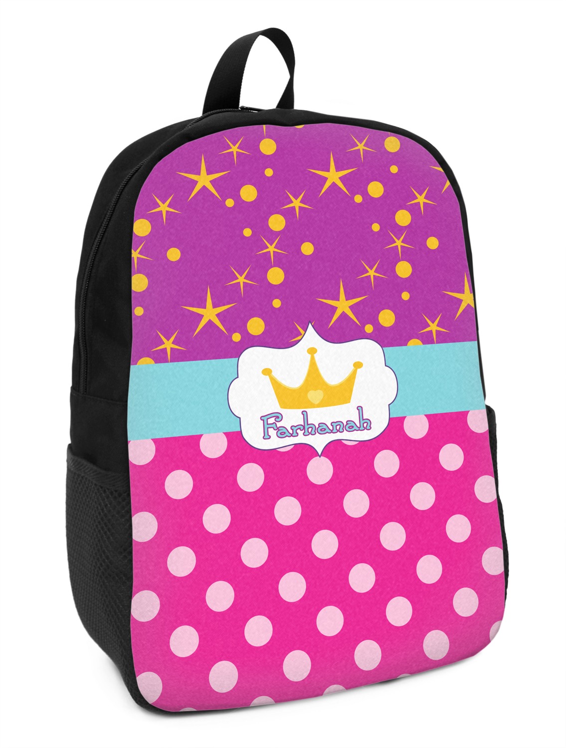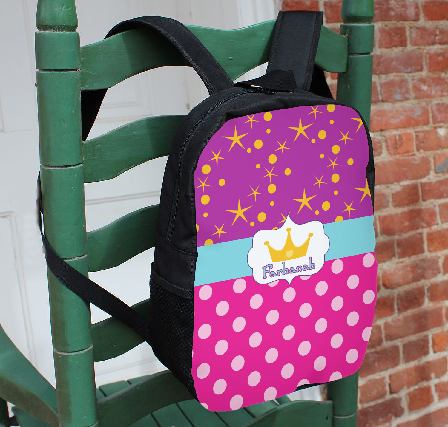 These small backpacks are made of a durable black canvas material with your personalization right on the front. The two shoulder straps are padded and easily adjustable. The bag itself measures at about 11" W x 15" H x 5" D. It's the perfect size for elementary aged kids or adults who want a smaller backpack. On the top of the bag you will find a handle to hang or carry your backpack by as well as a large zipper closure to keep all of your belongings safe inside. On each side of your backpack is a mesh pocket for a small item or water bottle. Inside your backpack you will find a spacious area with a small zipper pocket and a padded laptop slot that will fit up to a 13" laptop (13" being very snug). This is the perfect bag for any student that needs a couple books and their laptop with them at all times. It also works great as a carry on for traveling!