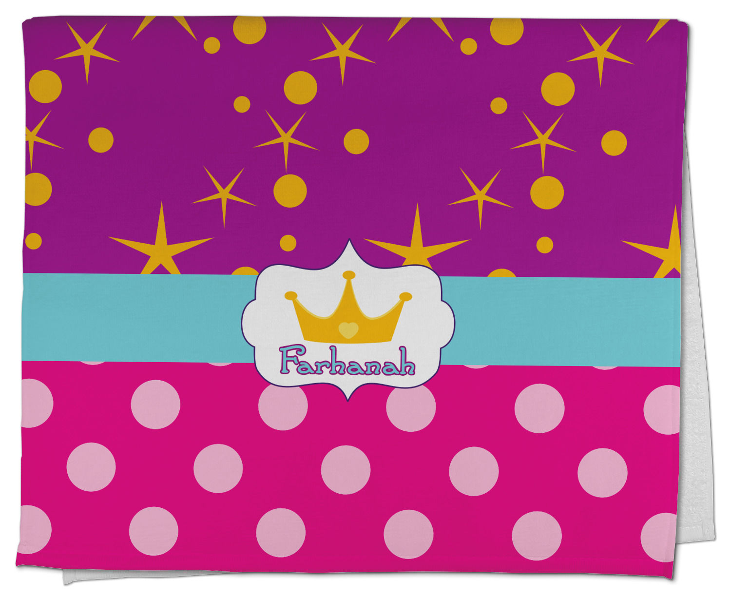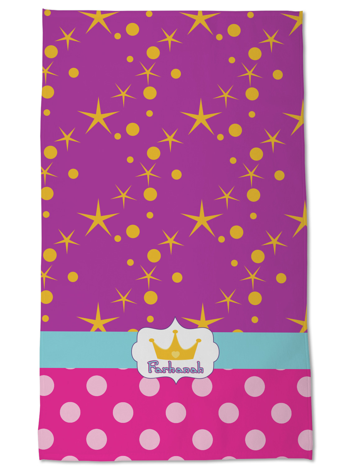 Set with fun colors of purple, pink, and teal, the design highlights a decorative label, the perfect place for the name of your little princess.