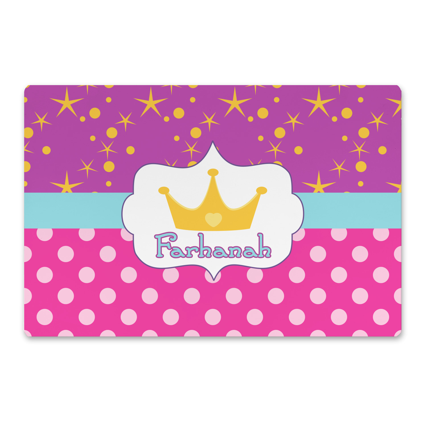 Set with fun colors of purple, pink, and teal, the design highlights a decorative label, the perfect place for the name of your little princess.