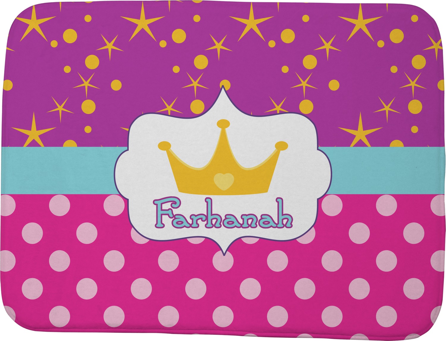 Set with fun colors of purple, pink, and teal, the design highlights a decorative label, the perfect place for the name of your little princess.