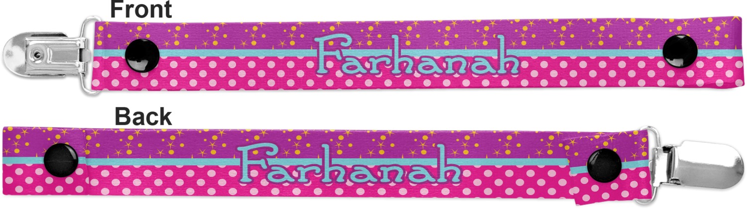 This personalized pacifier clip is the ideal size and measures at approximately 7.5 inches in length, when either end is snapped closed. On one end, you'll find a snap button. This button of your baby's pacifier holder is what can be attached to their pacifier to hold is securely in place. Simply open the snap, slip it through the pacifier opening, and snap it back into place. On the opposite end of this baby pacifier holder, you'll find a metal clip that can secure to a baby's collar or sleeve. This clip ensures that the strap stays in place, and that your baby's pacifier is always on hand.