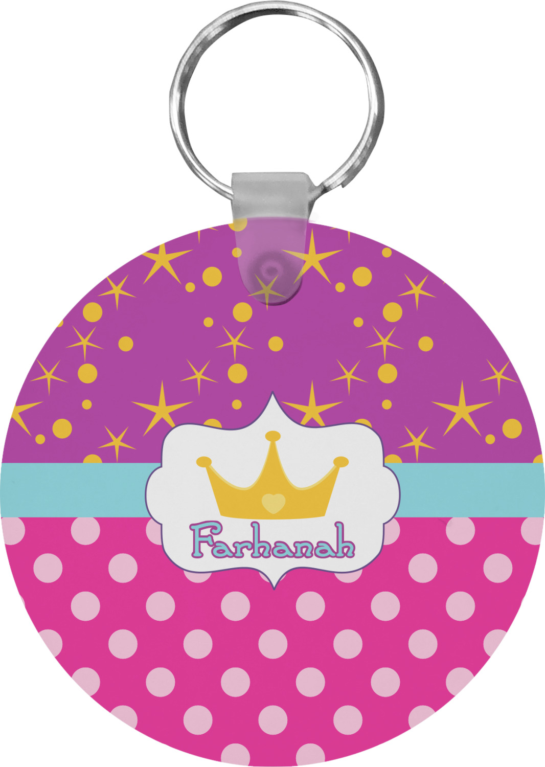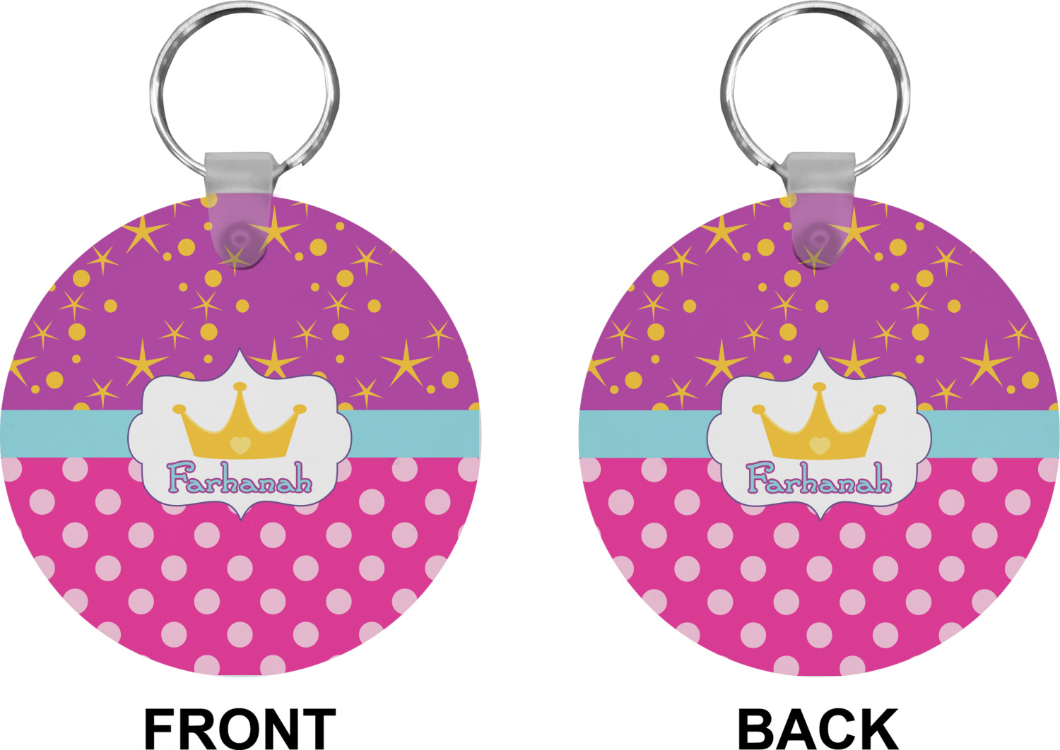 Our personalized keychains attach to the included metal, split key ring with a plastic, removable snap. Since a metal ring is included with your purchase, you have the liberty to keep your keys together on the ring, with or without your unique keychain. We offer this keychain in three different shapes: circle, heart, or diamond. We print your personalized design(s) on both sides of the key chain, and the surface has a glossy, reflective finish that only emphasizes your design. Each keychain is approximately 2.25 by 2.25 inches.