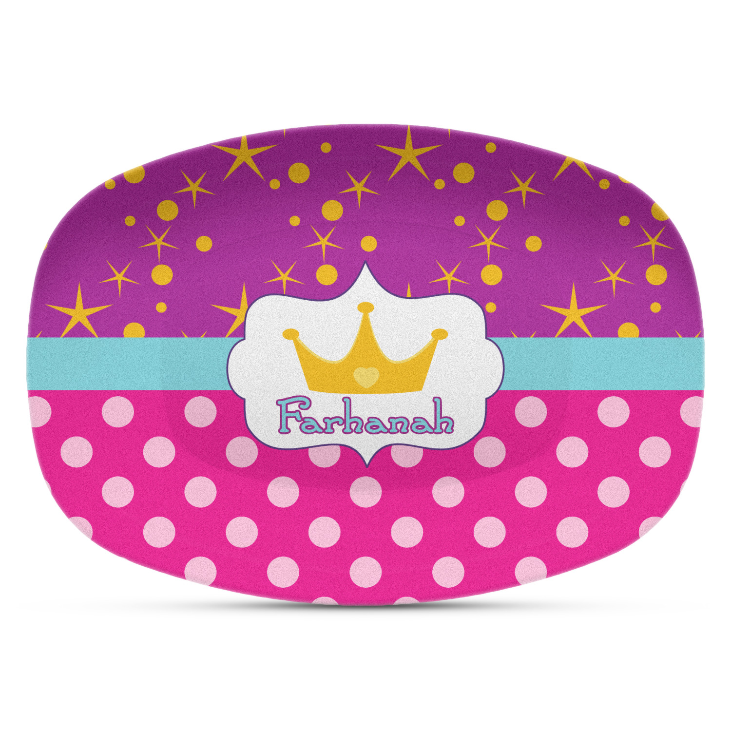 Set with fun colors of purple, pink, and teal, the design highlights a decorative label, the perfect place for the name of your little princess.