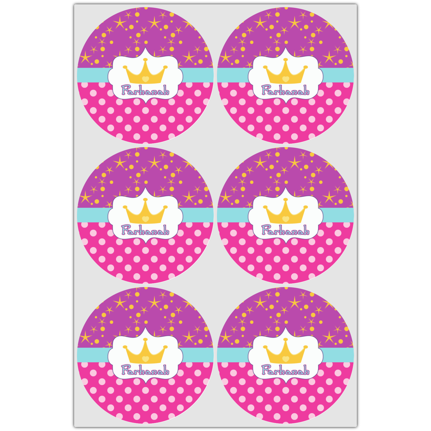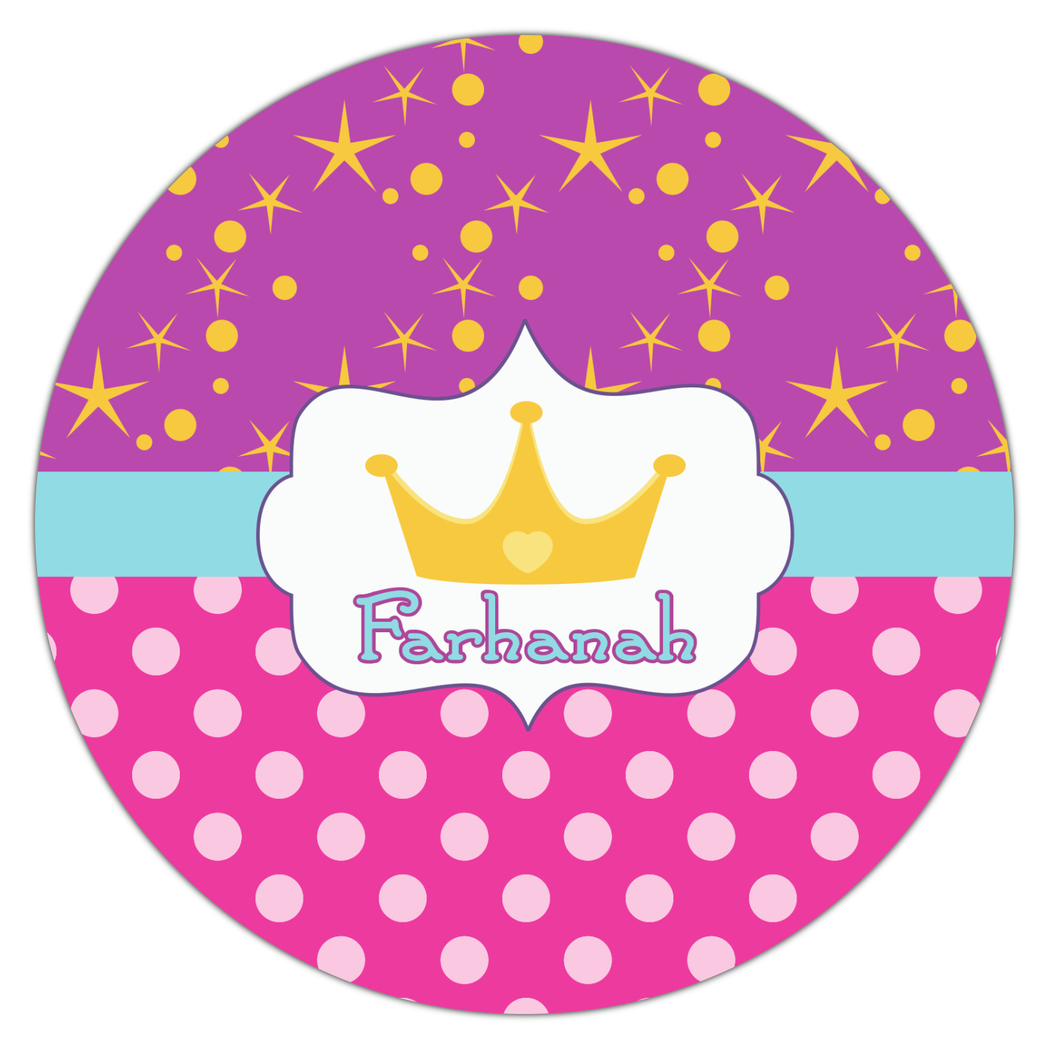 Set with fun colors of purple, pink, and teal, the design highlights a decorative label, the perfect place for the name of your little princess.