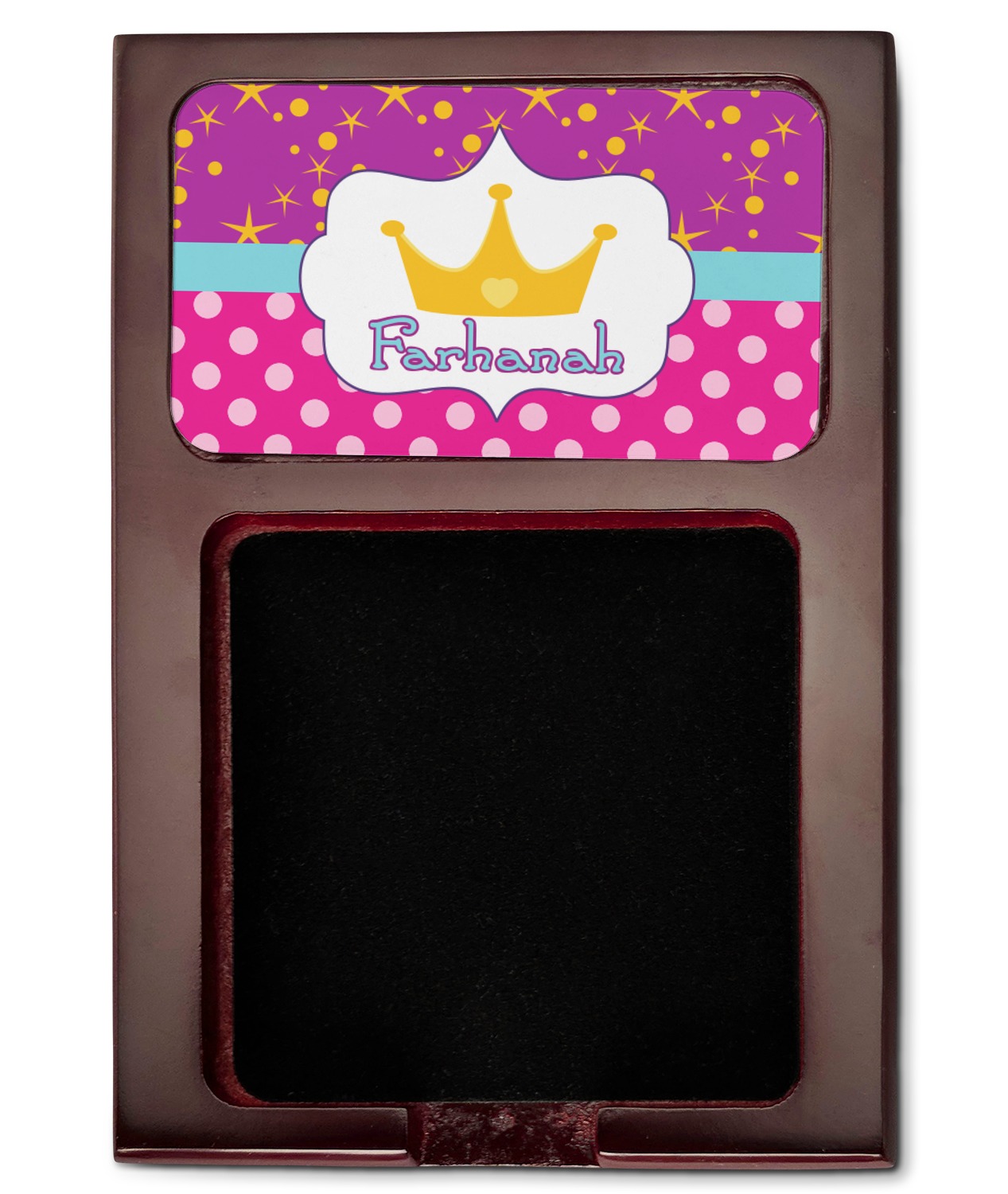 Crafted from a fine mahogany, this post it note holder is in the shade of a dark, cherry color. The dispenser itself is about 4.25 by 6.25 by 0.75 inches. You can place your 3 by 3 inch sticky notes in the indentation below the nameplate. We print your customization onto the nameplate that rests above the velvety indentation.