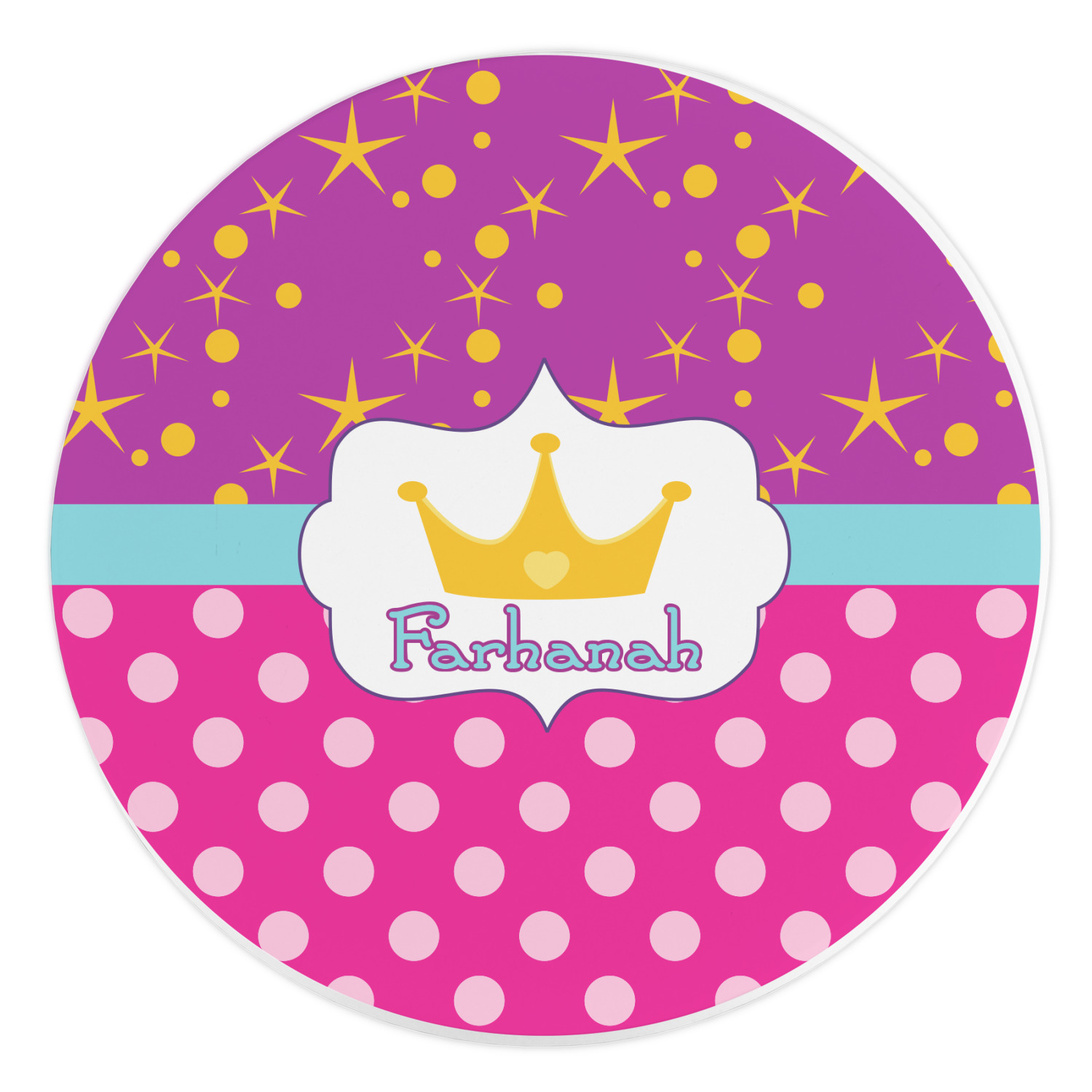 Set with fun colors of purple, pink, and teal, the design highlights a decorative label, the perfect place for the name of your little princess.