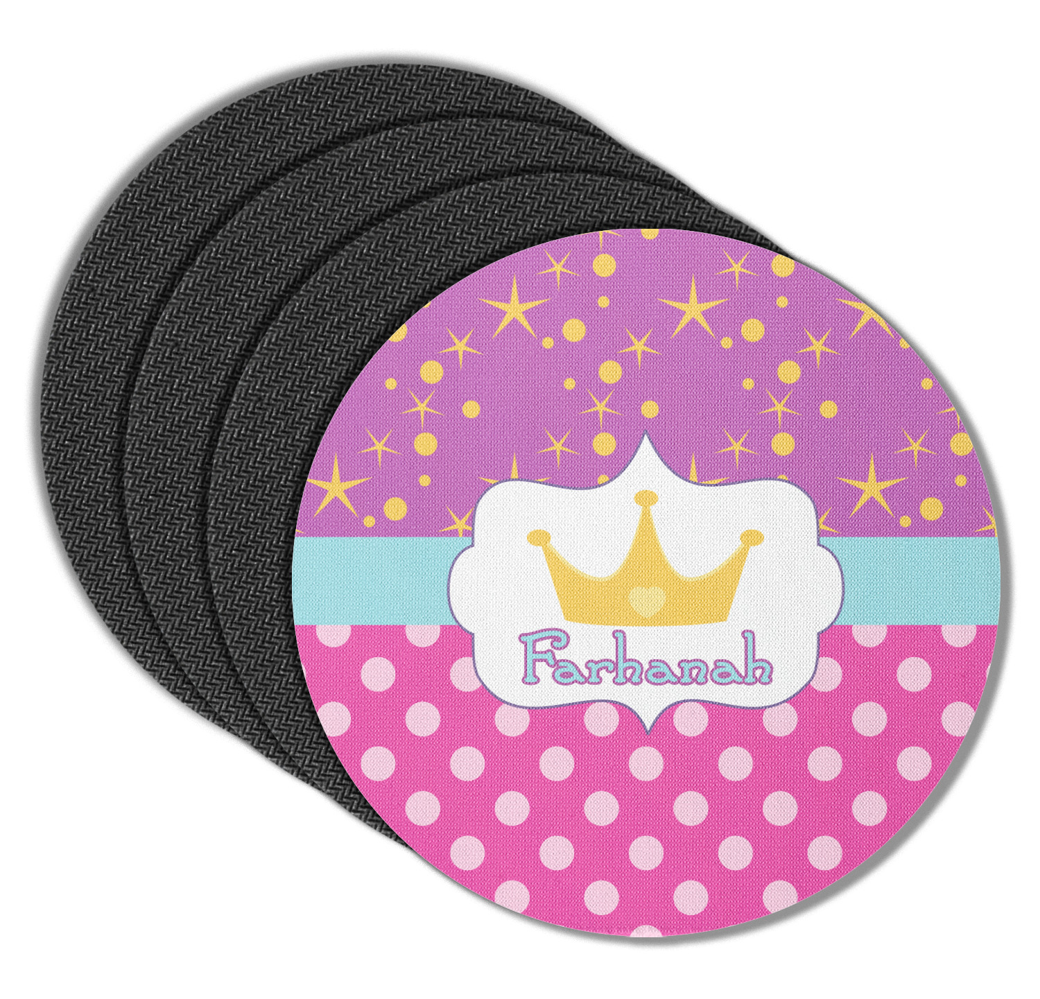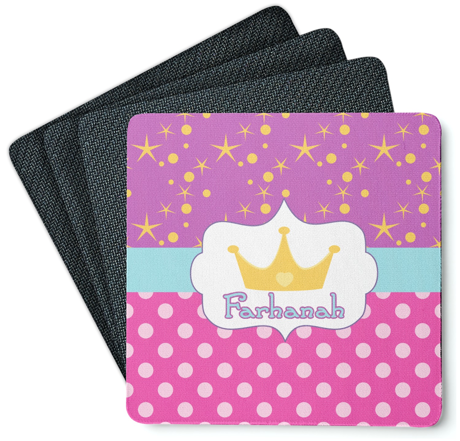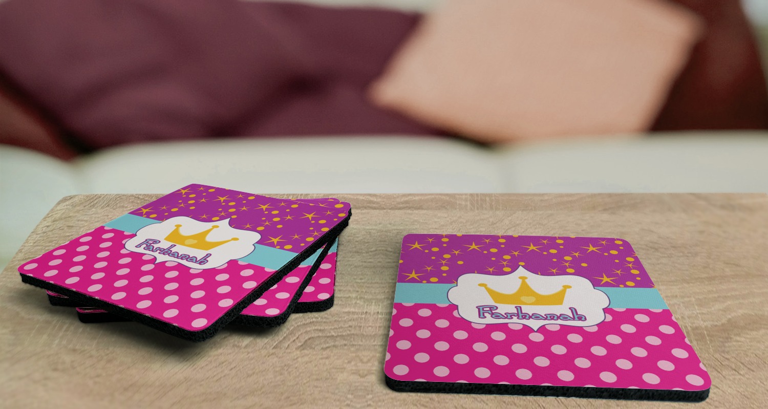 These drink coasters have a smooth, polyester top and a textured, rubber backing on its bottom. The non-slip rubber backing underneath works to keep any spills at bay. At 4 by 4 by 0.25 inches thick, these custom coasters are a suitable size for most drinkware. Your personalization is displayed atop the face of the cup coaster. We sell these rubber coasters in two different shapes: square and round. You can buy each shape as singulars or as a set of 4.