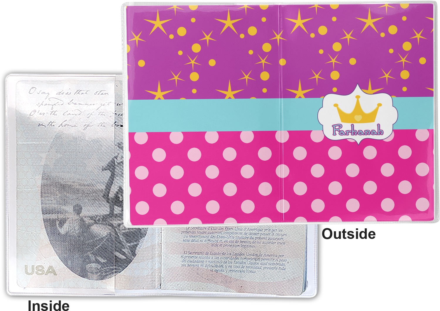 This cover is made of a sturdy clear vinyl with a personalized vinyl insert inside. There is a large and a small pocket on either side to hold the covers of your passport easily and firmly. The passport holder is approximately 7.5" x 5.25", the perfect size to snugly fit your passport. This slim cover is the perfect way to protect your passport without being one more bulky item you have to carry.