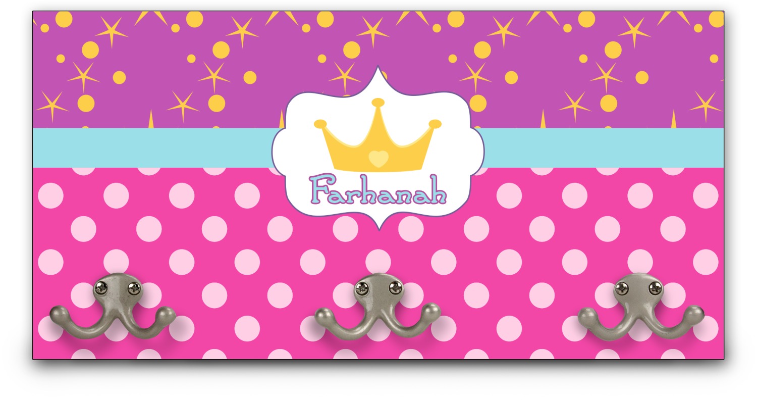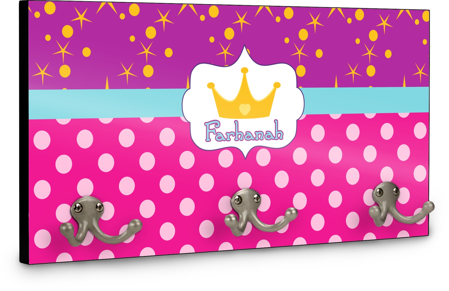 This coat rack is the perfect way to add some personality to your wall or entryway. The board is made of a strong maple that is approximately 16" x 8". The three 2-prong hooks are a sturdy metal that have three screws attaching them to the board. Your design is printed right onto the front of the board while the back and sides are a simple black.