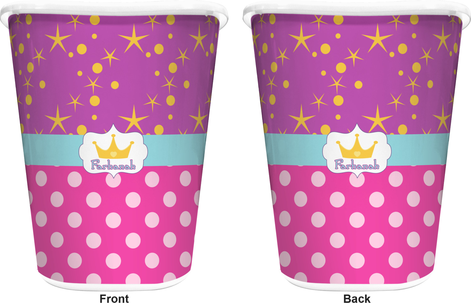 You can choose to purchase these decorative wastebaskets in either a white or a black color that will show on the base and the upper rim. Your customization is printed on a high-gloss, fine-quality vinyl adhesive, and you can choose to either have this adhesive applied to one side only or to both sides. As such, this plastic wastebasket can be single-sided or double-sided, depending on your creative vision. Your customization is printed using durable inks, making the design waterproof and resistant to fading over time.