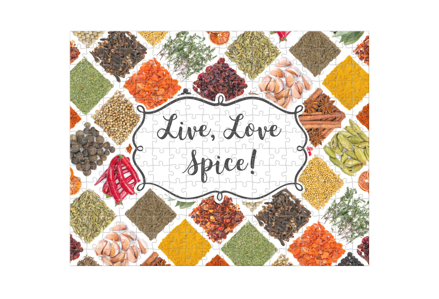 The words "Live, Love, Spice" are featured in a curly frame in the middle of this design. You can easily customize the words to your liking. We have other herb & spice patterns in our library - so feel free to browse and use the pattern that appeals to you. Let us know if there is anything that we can help you with.