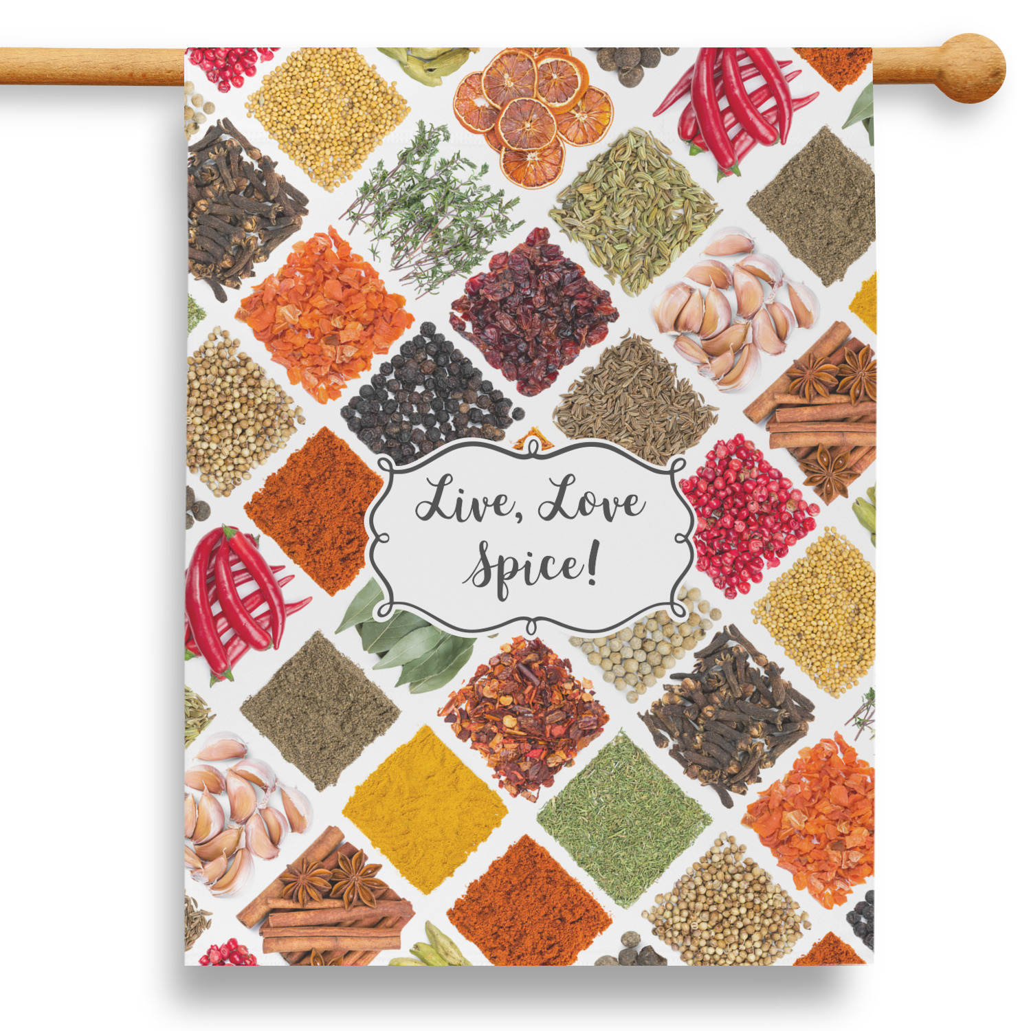 The words "Live, Love, Spice" are featured in a curly frame in the middle of this design. You can easily customize the words to your liking. We have other herb & spice patterns in our library - so feel free to browse and use the pattern that appeals to you. Let us know if there is anything that we can help you with.
