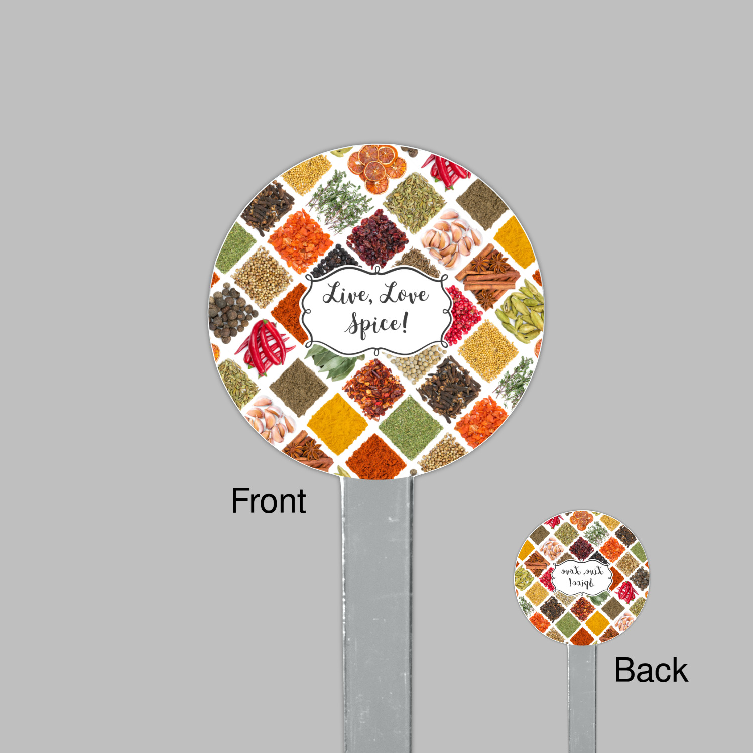 The words "Live, Love, Spice" are featured in a curly frame in the middle of this design. You can easily customize the words to your liking. We have other herb & spice patterns in our library - so feel free to browse and use the pattern that appeals to you. Let us know if there is anything that we can help you with.