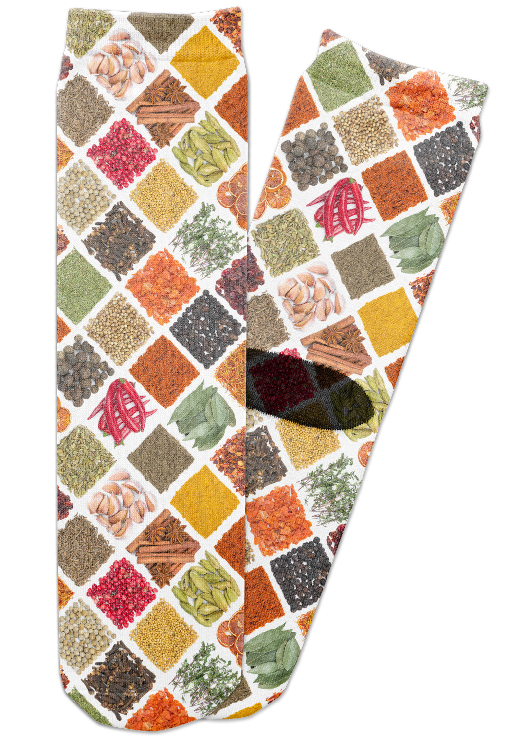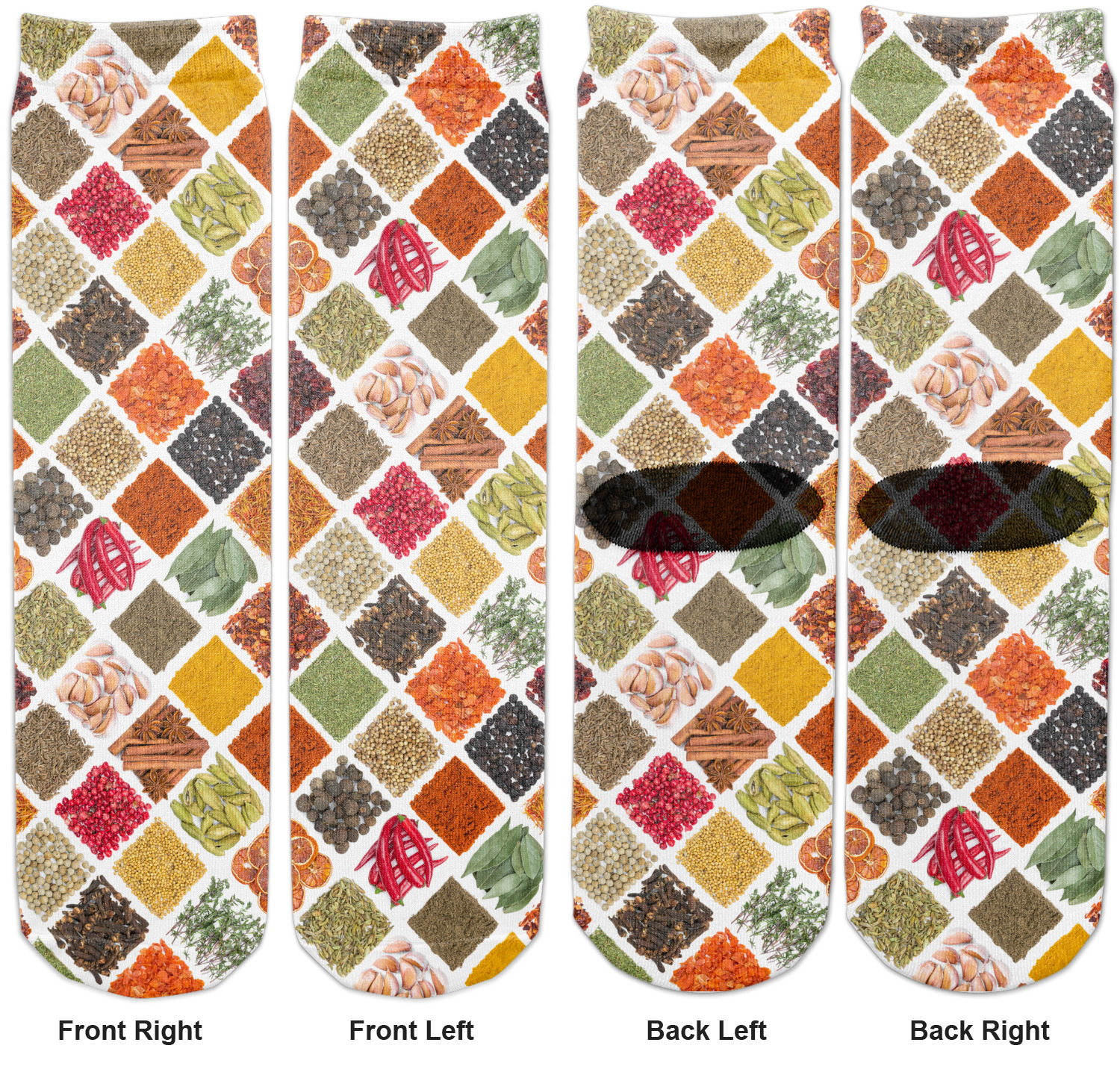 The main pattern is made of various spices such as dried thyme, white pepper, coriander, cumin, turmeric, red chili peppers and a whole lot more. The spices are all laid out in a fun diamond repeating pattern. This design simply looks stunning on any cook wear and more.