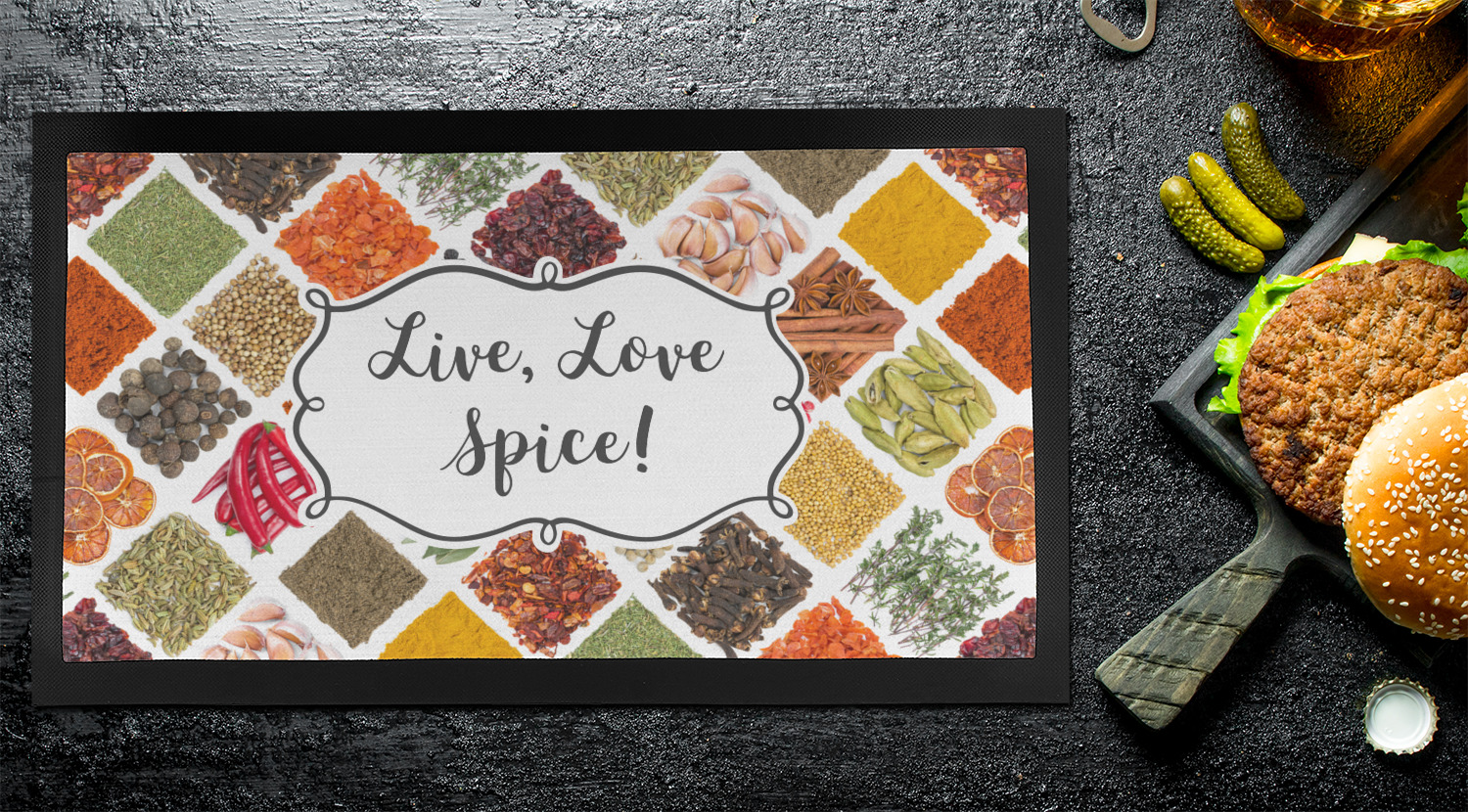 The words "Live, Love, Spice" are featured in a curly frame in the middle of this design. You can easily customize the words to your liking. We have other herb & spice patterns in our library - so feel free to browse and use the pattern that appeals to you. Let us know if there is anything that we can help you with.