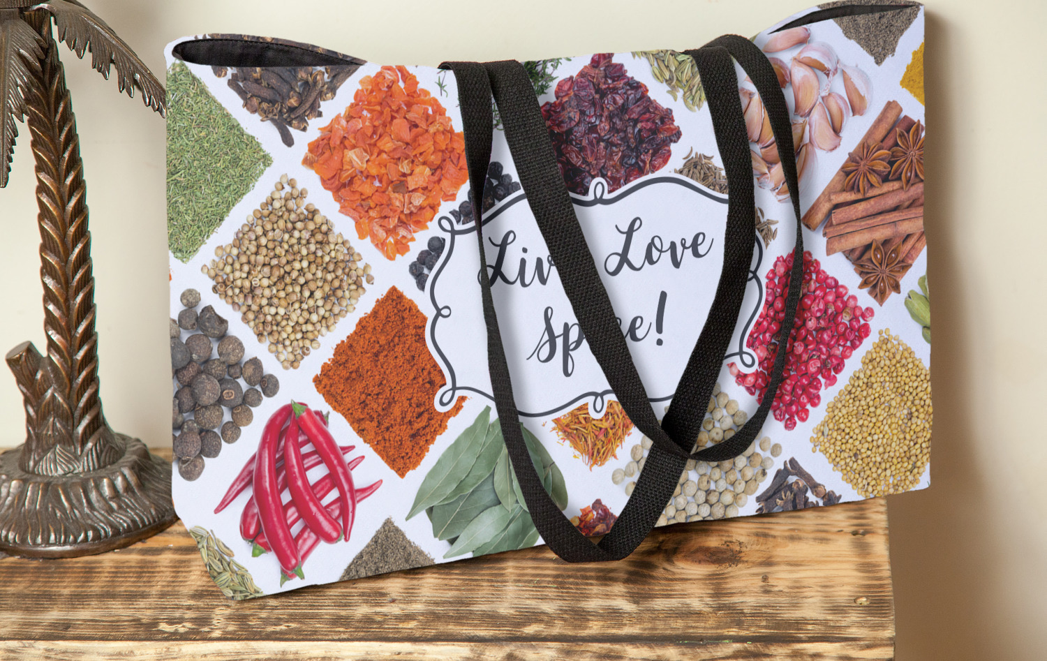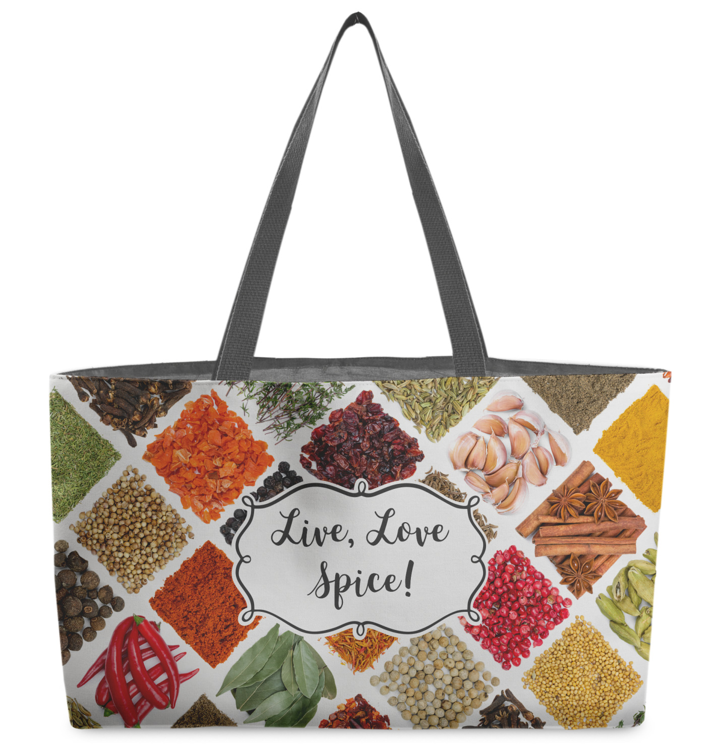 The words "Live, Love, Spice" are featured in a curly frame in the middle of this design. You can easily customize the words to your liking. We have other herb & spice patterns in our library - so feel free to browse and use the pattern that appeals to you. Let us know if there is anything that we can help you with.